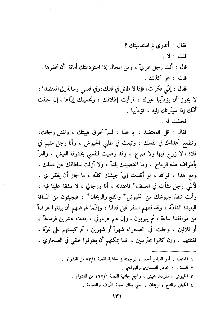 فقال: قل للمعتضد، يا هذا، لم تخرق هيبتك، وتقتل رجالك، وتطمع أعداءك في نفسك، وتبعث في طلبي الجيوش، وأنا رجل مقيم في فلاة، لا زرع فيها ولا ضرع، وقد رضيت لنفسي بخشونة العيش، والعزّ بأطراف هذه الرماح، وما اغتصبتك بلدا، ولا أزلت سلطانك عن عملك، ومع هذا، فو الله، لو أنفذت إليّ جيشك كلّه، ما جاز أن يظفر بي، لأنّي رجل نشأت في العسف «2» فاعتدته، أنا ورجالي، لا مشقة علينا فيه، وأنت تنفذ جيوشك من الخيوش «3» والثلج والريحان «4» ، فيجيئون من المسافة البعيدة الشاقّة، وقد قتلهم السفر قبل قتالنا، وإنّما غرضهم أن يبلغوا غرضا من مواقفتنا ساعة، ثم يهربون، وإن هم هزموني، بعدت عشرين فرسخا، أو ثلاثين، وجلت في الصحراء شهرا أو شهرين، ثم كبستهم على غرّة، فقتلتهم، وإن كانوا محترسين، فما يمكنهم أن يطوفوا خلفي في الصحاري،