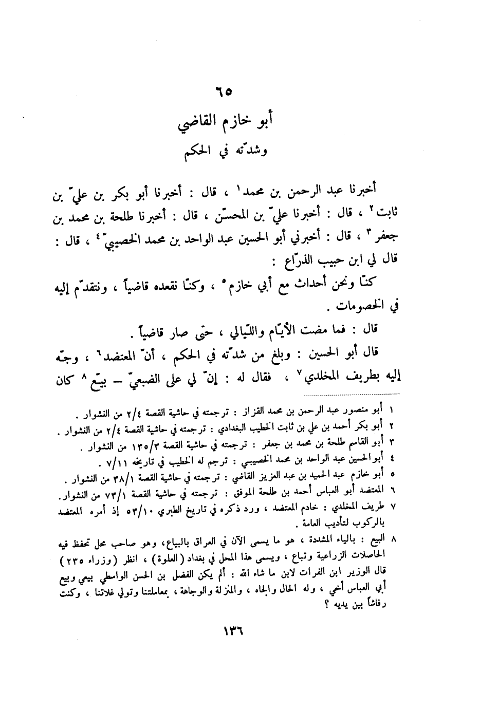 أخبرنا عبد الرحمن بن محمد «1» ، قال: أخبرنا أبو بكر بن عليّ بن ثابت «2» ، قال: أخبرنا عليّ بن المحسّن، قال: أخبرنا طلحة بن محمد بن جعفر «3» ، قال: أخبرني أبو الحسين عبد الواحد بن محمد الخصيبيّ «4» ، قال: