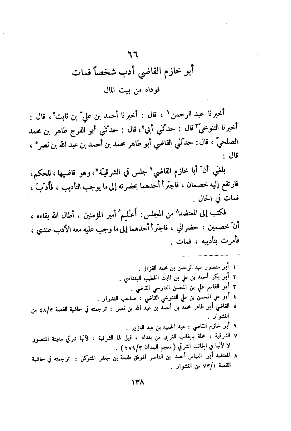 أخبرنا التنوخيّ «3» قال: حدّثني أبي «4» ، قال: حدّثني أبو الفرج طاهر بن محمد الصلحيّ، قال: حدّثني القاضي أبو طاهر محمد بن أحمد بن عبد الله بن نصر «5» ، قال: