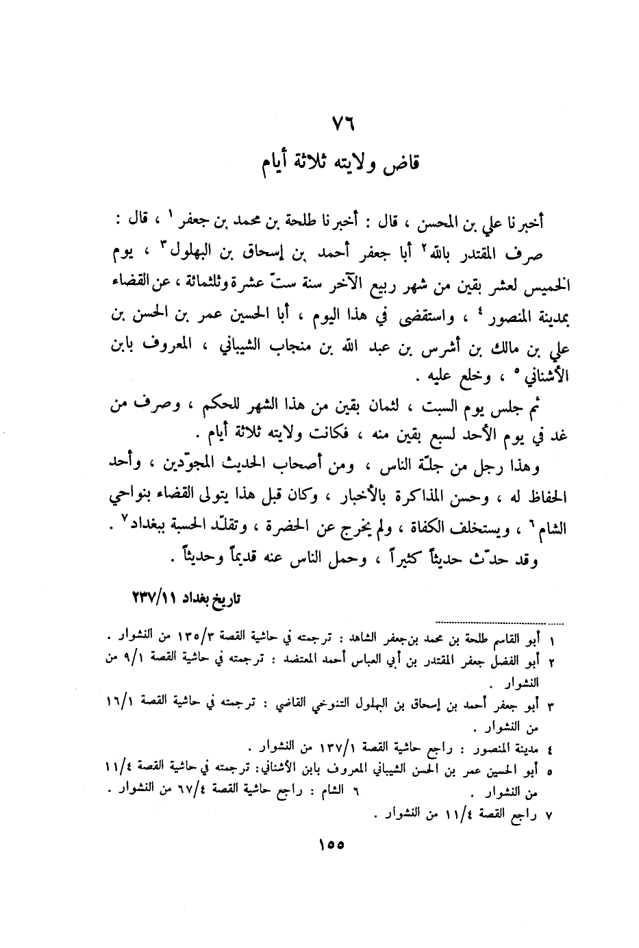 وهذا رجل من جلّة الناس، ومن أصحاب الحديث المجوّدين، وأحد الحفاظ له، وحسن المذاكرة بالأخبار، وكان قبل هذا يتولى القضاء بنواحي الشام «6» ، ويستخلف الكفاة، ولم يخرج عن الحضرة، وتقلّد الحسبة ببغداد «7» .