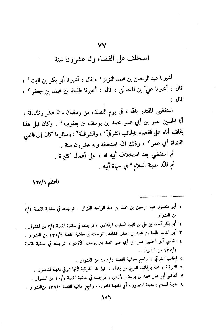 استقضى المقتدر بالله، في يوم النصف من رمضان سنة عشر وثلاثمائة، أبا الحسين عمر بن أبي عمر محمد بن يوسف بن يعقوب «4» ، وكان قبل هذا يخلف أباه على القضاء بالجانب الشرقيّ «5» ، والشرقيّة «6» ، وسائر ما كان إلى قاضي القضاة أبي عمر «7» ، وذلك انّه استخلفه وله عشرون سنة.
