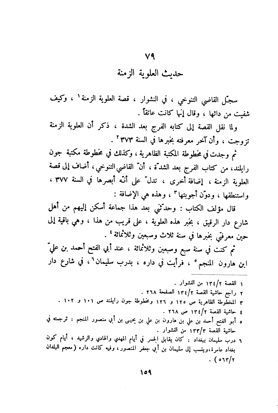 ثم وجدت في مخطوطة المكتبة الظاهرية، وكذلك في مخطوطة مكتبة جون رايلند، من كتاب الفرج بعد الشدّة، أنّ القاضي التنوخي، أضاف إلى قصة العلوية الزمنة، إضافة أخرى، تدلّ على أنّه أبصرها في السنة 377، واستنطقها، ودوّن أجوبتها «3» ، وهذه هي الإضافة: