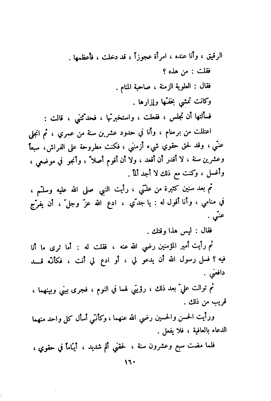 ثم بعد سنين كثيرة من علّتي، رأيت النبي صلى الله عليه وسلّم، في منامي، وأنا أقول له: يا جدّي، ادع الله عزّ وجلّ، أن يفرّج عنّي.