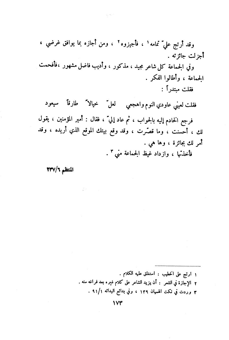 وقد أرتج عليّ تمامه «1» ، فأجيزوه «2» ، ومن أجازه بما يوافق غرضي، أجزلت جائزته.