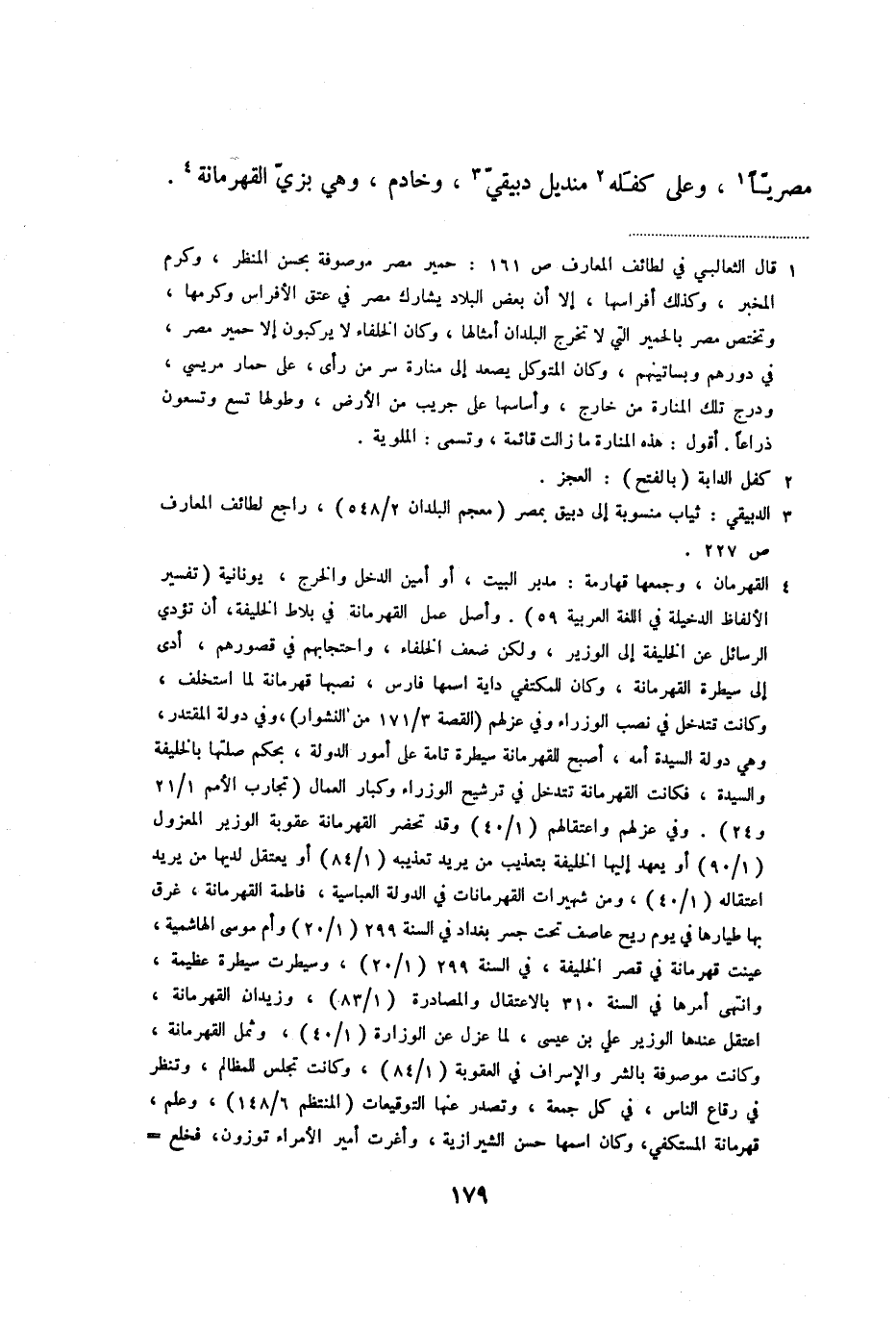 مصريّا «1» ، وعلى كفله «2» منديل دبيقيّ «3» ، وخادم، وهي بزيّ القهرمانة «4» .
