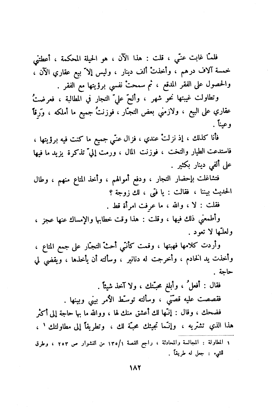فلمّا غابت عنّي، قلت: هذا الآن، هو الحيلة المحكمة، أعطتني خمسة آلاف درهم، وأخذت ألف دينار، وليس إلّا بيع عقاري الآن، والحصول على الفقر المدقع، ثم سمحت نفسي برؤيتها مع الفقر.