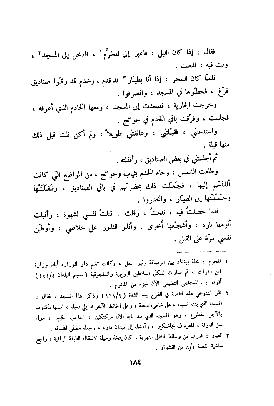 فلمّا كان السحر، إذا أنا بطيّار «3» قد قدم، وخدم قد رقّوا صناديق فرّغ، فحطّوها في المسجد، وانصرفوا.