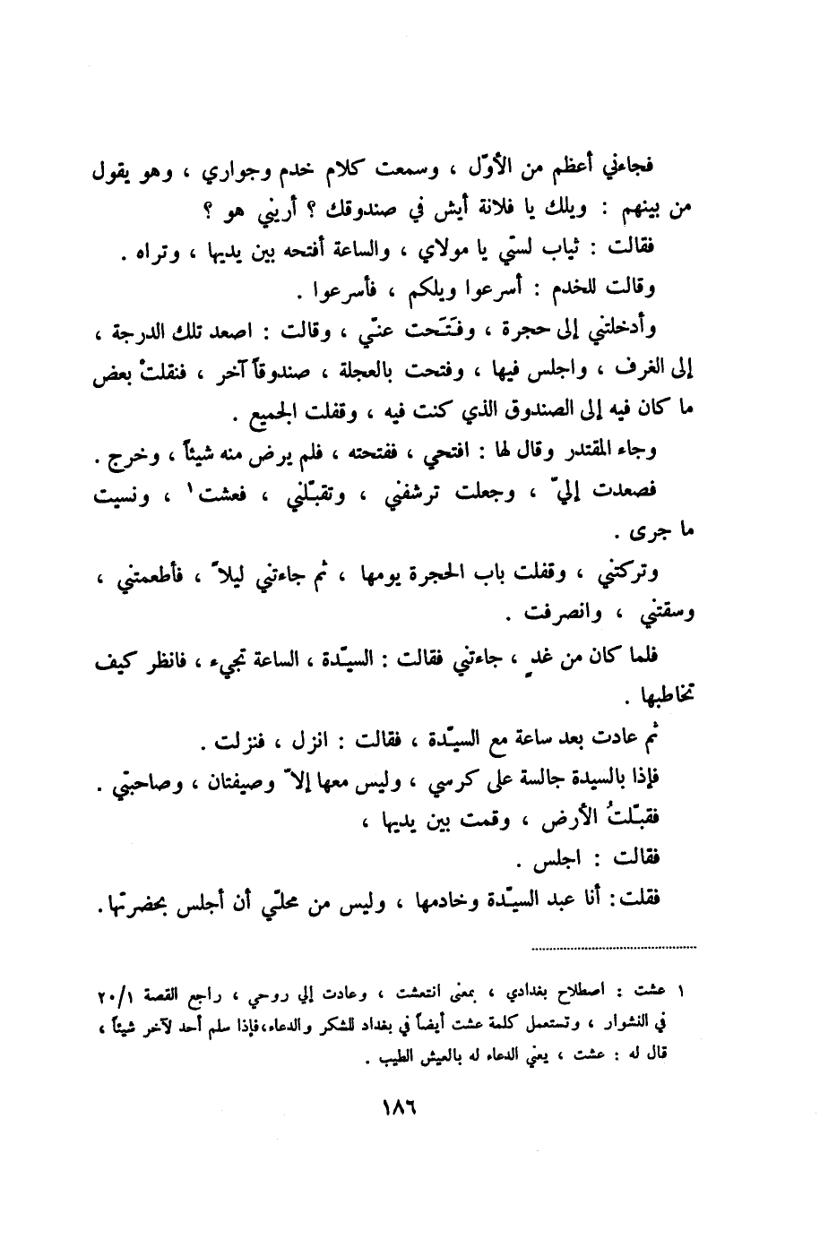 وأدخلتني إلى حجرة، وفتحت عنّي، وقالت: اصعد تلك الدرجة، إلى الغرف، واجلس فيها، وفتحت بالعجلة، صندوقا آخر، فنقلت بعض ما كان فيه إلى الصندوق الذي كنت فيه، وقفلت الجميع.
