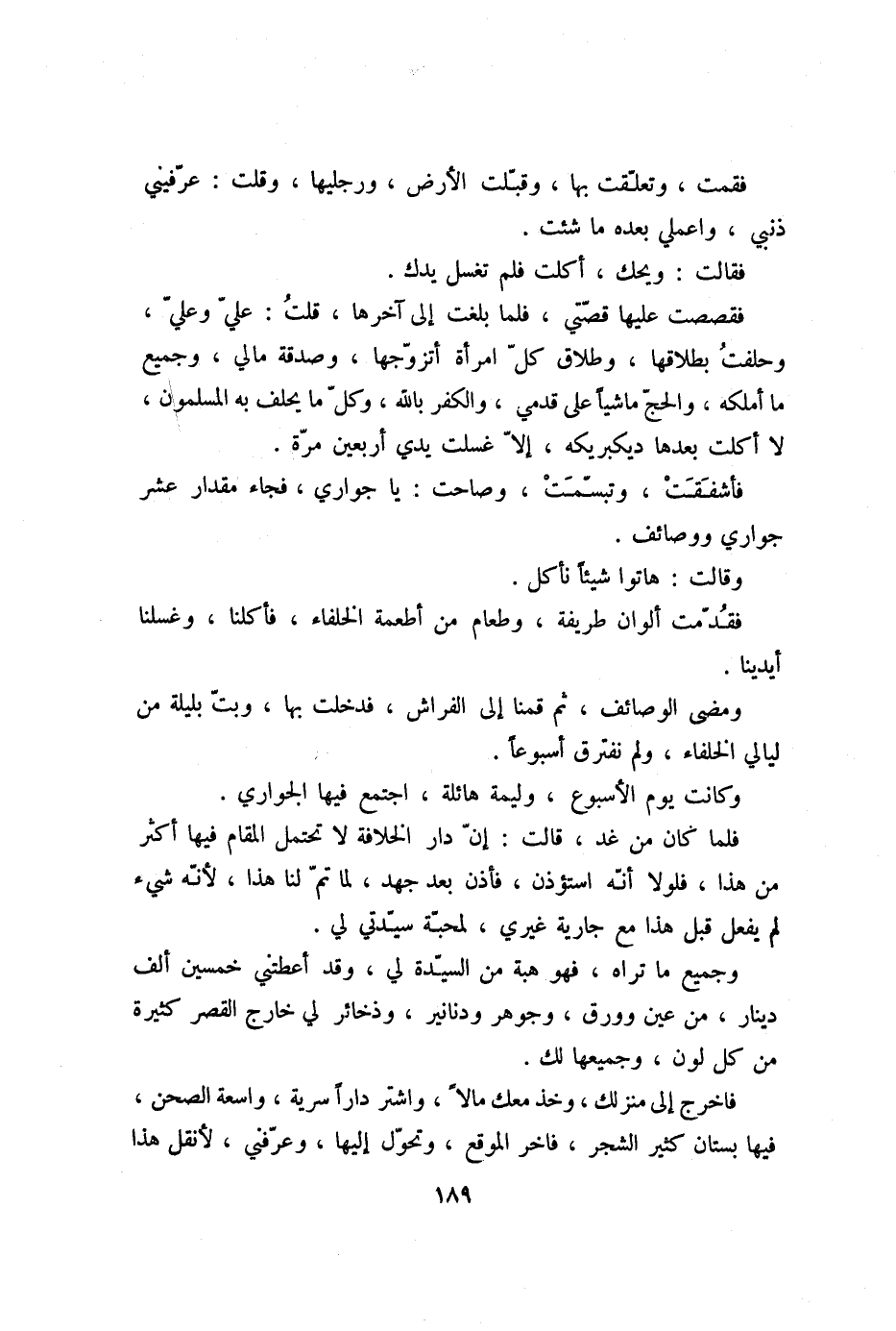 ومضى الوصائف، ثم قمنا إلى الفراش، فدخلت بها، وبتّ بليلة من ليالي الخلفاء، ولم نفترق أسبوعا.