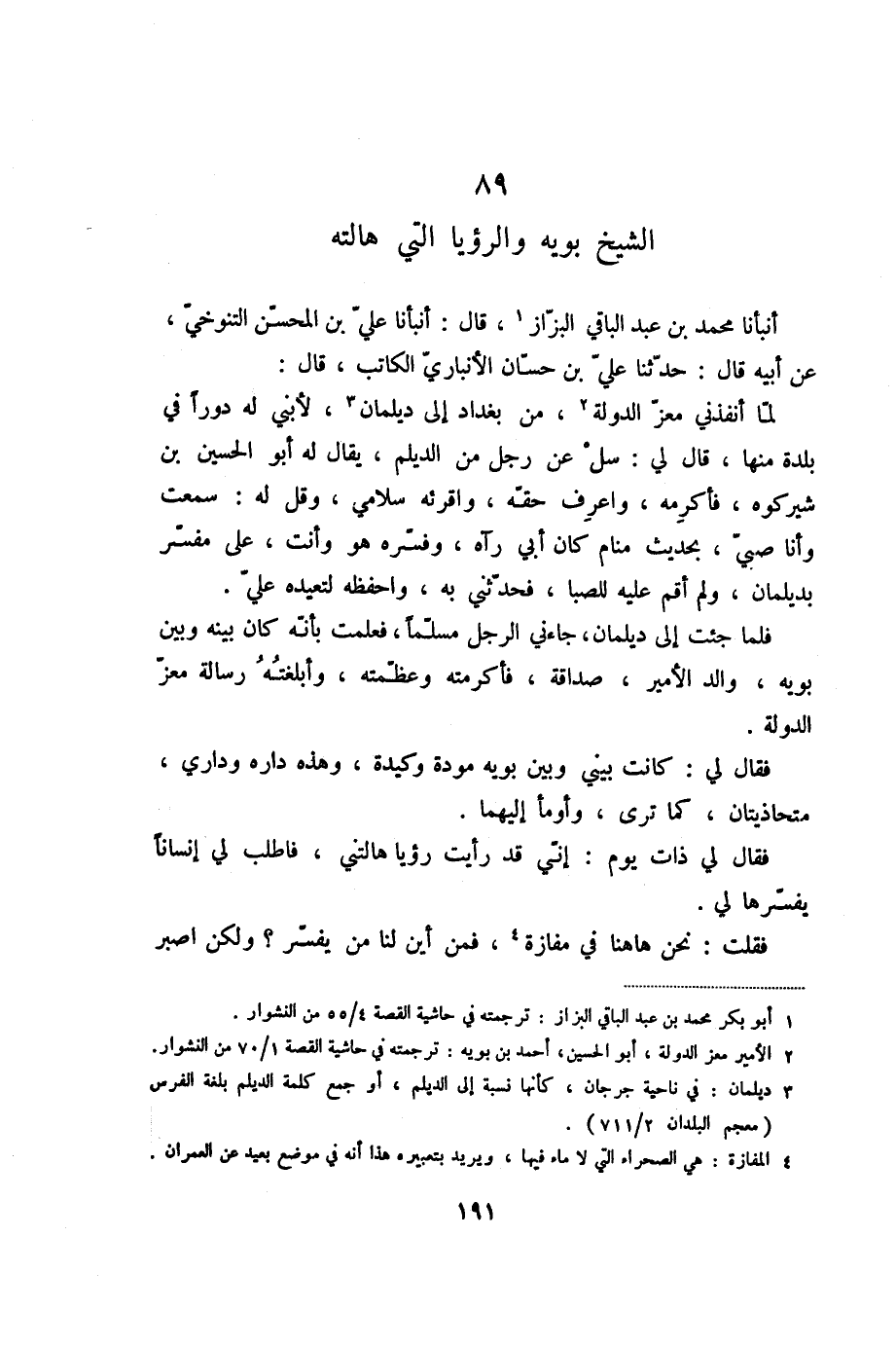 فلما جئت إلى ديلمان، جاءني الرجل مسلّما، فعلمت بأنّه كان بينه وبين بويه، والد الأمير، صداقة، فأكرمته وعظّمته، وأبلغته رسالة معزّ الدولة.