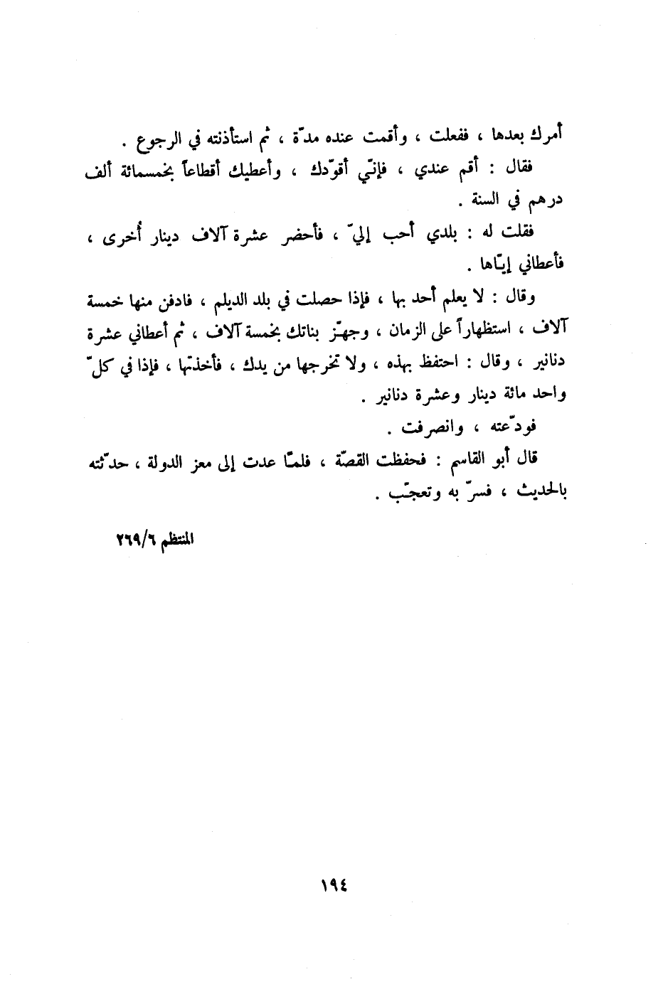 وقال: لا يعلم أحد بها، فإذا حصلت في بلد الديلم، فادفن منها خمسة آلاف، استظهارا على الزمان، وجهّز بناتك بخمسة آلاف، ثم أعطاني عشرة دنانير، وقال: احتفظ بهذه، ولا تخرجها من يدك، فأخذتها، فإذا في كلّ واحد مائة دينار وعشرة دنانير.