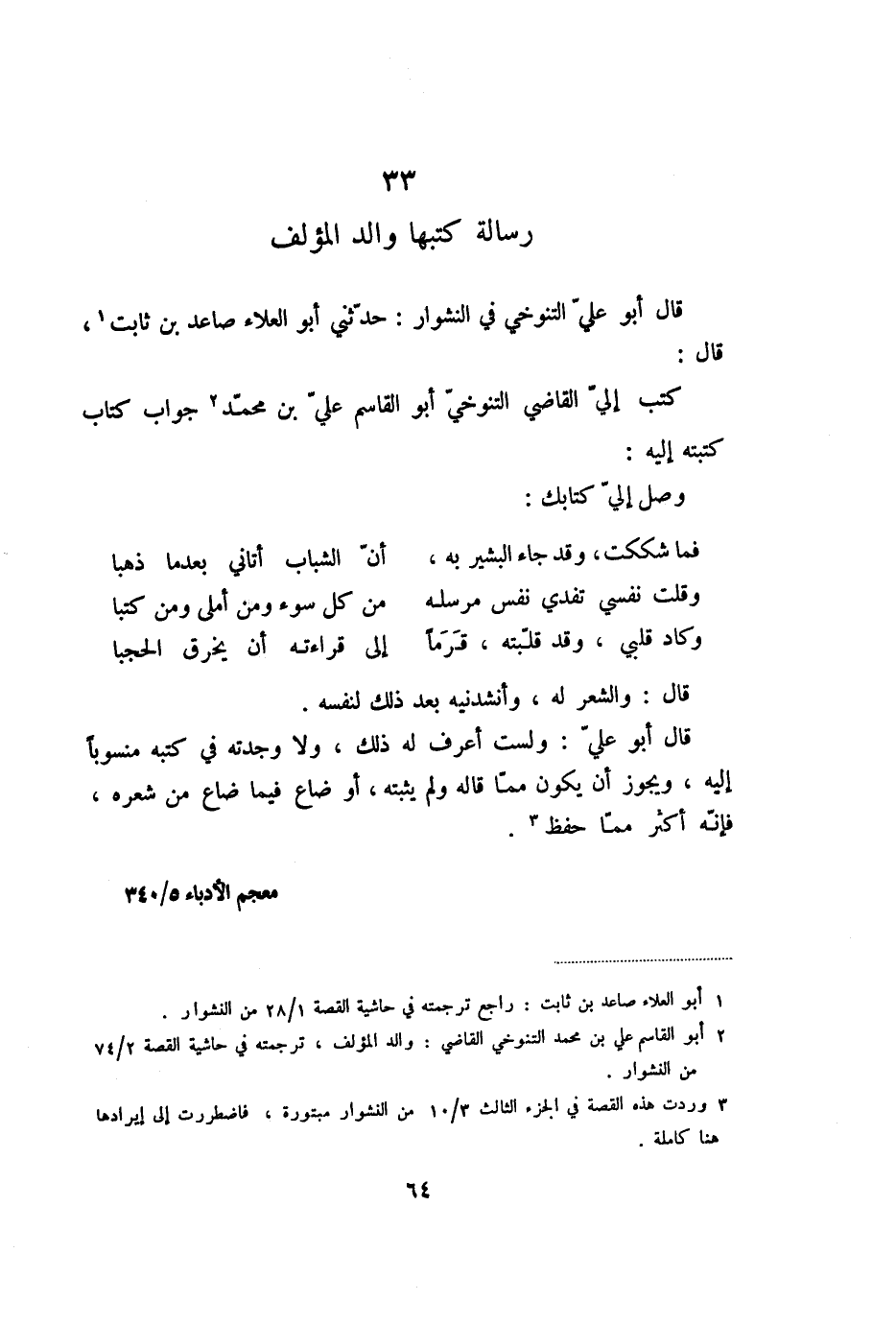 كتب إليّ القاضي التنوخيّ أبو القاسم عليّ بن محمّد «2» جواب كتاب كتبته إليه: