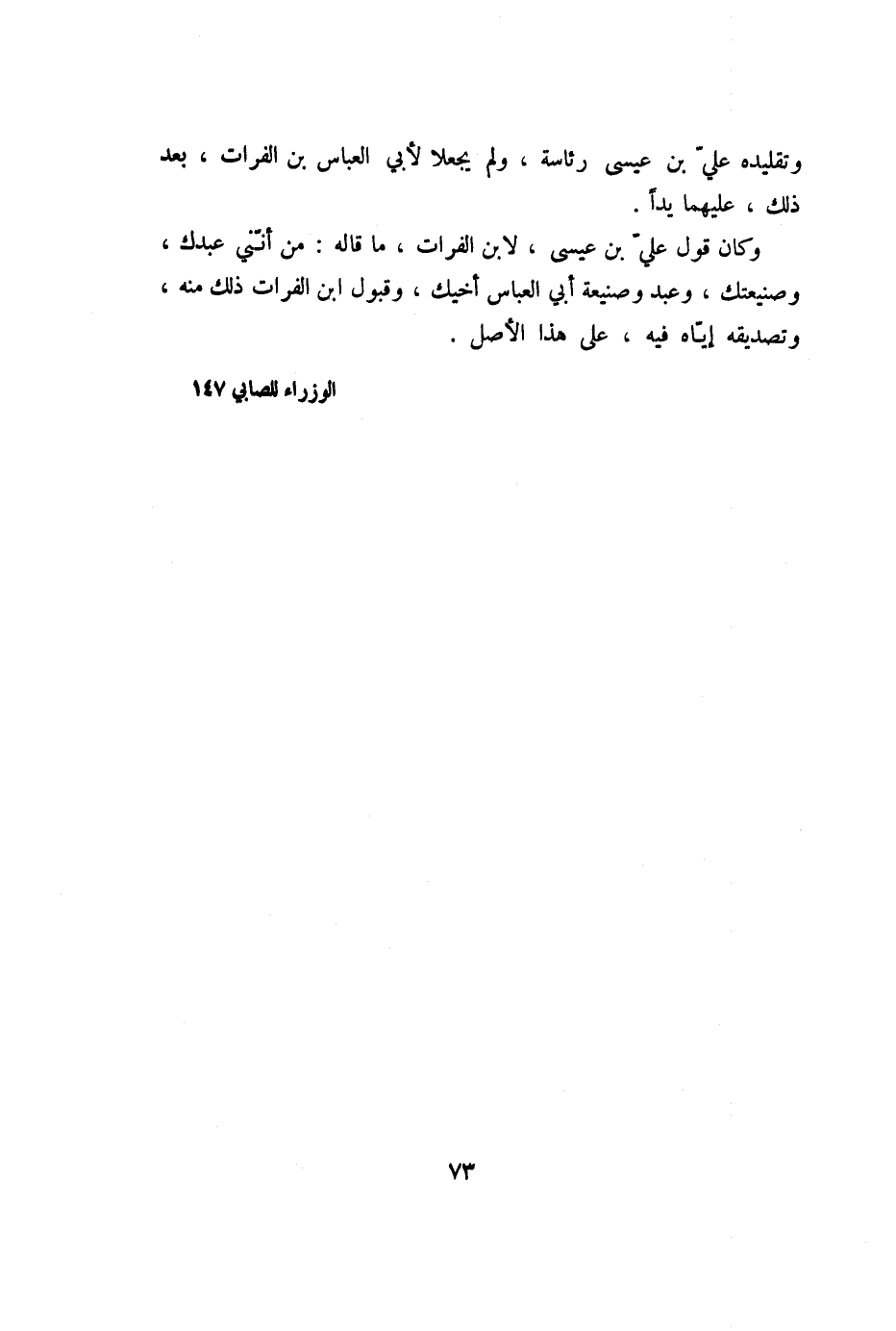 وتقليده عليّ بن عيسى رئاسة، ولم يجعلا لأبي العباس بن الفرات، بعد ذلك، عليهما يدا.
