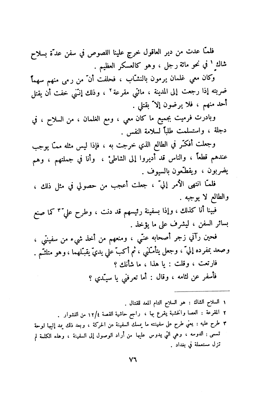 فلمّا عدت من دير العاقول خرج علينا اللصوص في سفن عدّة بسلاح شاك «1» في نحو مائة رجل، وهو كالعسكر العظيم.