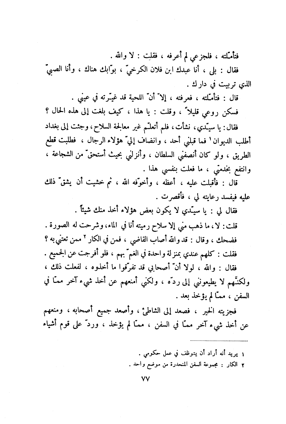 فقال: يا سيّدي، نشأت، فلم أتعلّم غير معالجة السلاح، وجئت إلى بغداد أطلب الديوان «1» فما قبلني أحد، وانضاف إليّ هؤلاء الرجال، فطلبت قطع الطريق، ولو كان أنصفني السلطان، وأنزلني بحيث أستحقّ من الشجاعة، وانتفع بخدمتي، ما فعلت بنفسي هذا.