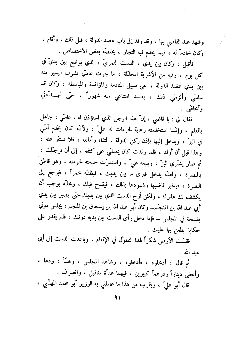 فقال لي: يا قاضي، إنّ هذا الرجل الذي استؤذن له، عامّي، جاهل بالعلم، وإنّما استخدمته رعاية لحرمات له عليّ، ولأنّه كان يخدم أمّي في البزّ، ويدخل إليها بإذن ركن الدولة، لتقاه وأمانته، فلا تستتر عنه، وهذا قبل أن أولد، فلما ولدت كان يحملني على كتفه، إلى أن ترجّلت، ثم صار يشتري البزّ، ويبيعه عليّ، واستمرّت خدمته لحرمته، وهو قاطن بالبصرة، ولعلّه يدخل فيرى ما بين يديك، فيظنّه خمرا، فيرجع إلى البصرة، فيخبر قاضيها وشهودها بذلك، فيقدح فيك، ومحلّه يوجب أن يكشف لك عذرك، ولكن أزح الدست الذي بين يديك حتى يصير بين يدي أبي عبد الله بن المنجّم- وكان أبو عبد الله بن إسحاق بن المنجم، يجلس دوني بفسحة في المجلس- فإذا دخل رأى الدست بين يديه دونك، فلم يقدر على حكاية يطعن بها عليك.