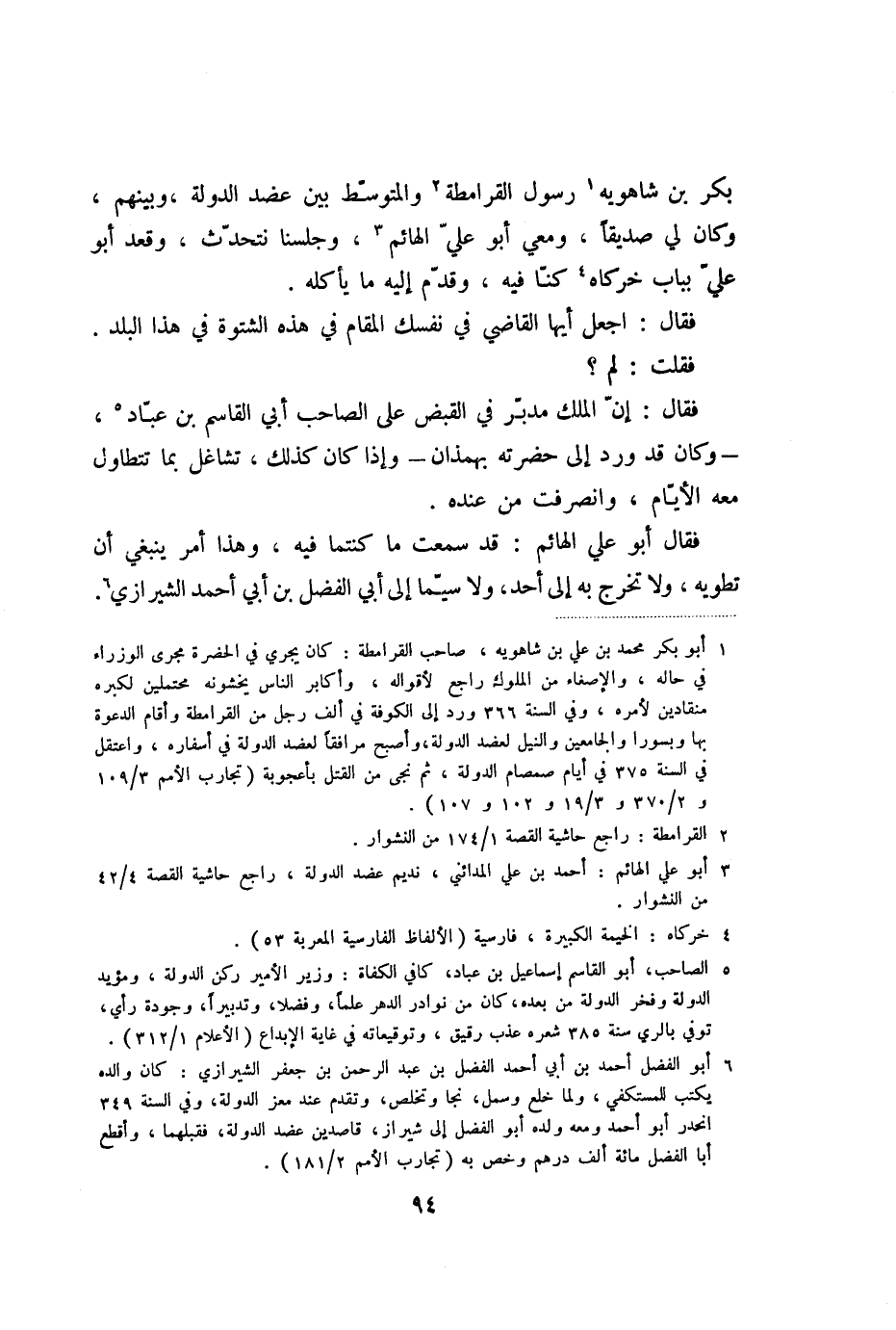 بكر بن شاهويه «1» رسول القرامطة «2» والمتوسّط بين عضد الدولة، وبينهم، وكان لي صديقا، ومعي أبو عليّ الهائم «3» ، وجلسنا نتحدّث، وقعد أبو عليّ بباب خركاه «4» كنّا فيه، وقدّم إليه ما يأكله.