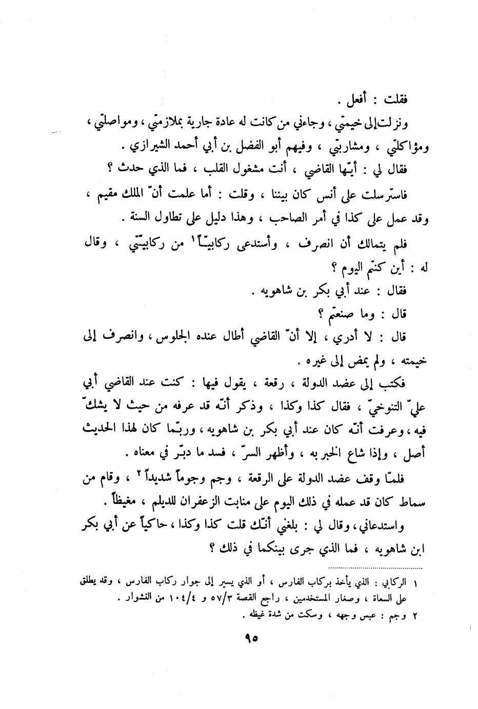 ونزلت إلى خيمتي، وجاءني من كانت له عادة جارية بملازمتي، ومواصلتي، ومؤاكلتي، ومشاربتي، وفيهم أبو الفضل بن أبي أحمد الشيرازي.