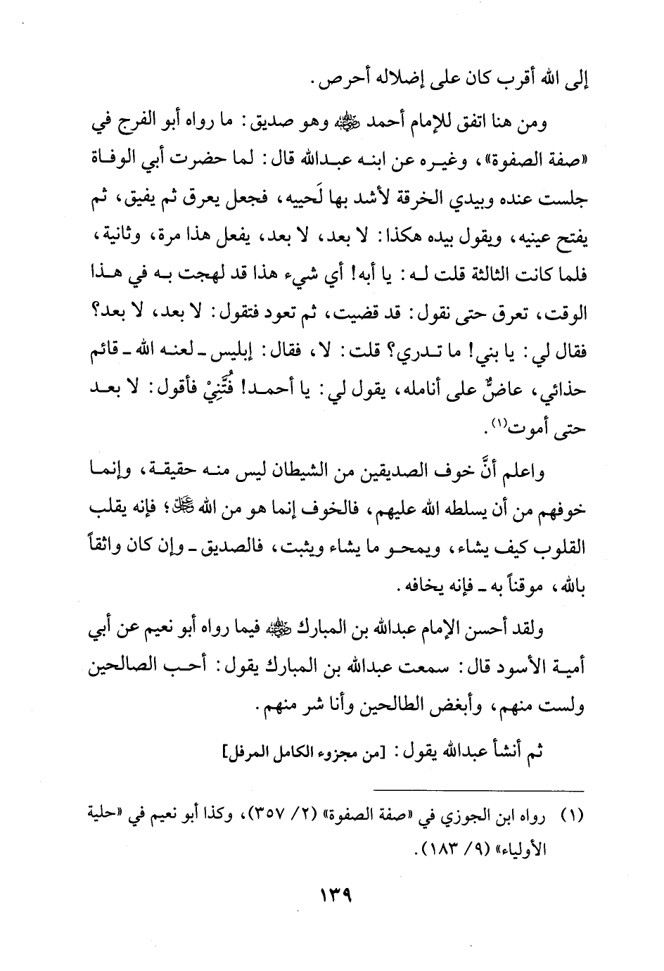 ولقد أحسن الإِمام عبد الله بن المبارك - رضي الله عنه - فيما رواه أبو نعيم عن أبي أمية الأسود قال: سمعت عبد الله بن المبارك يقول: أحب الصالحين ولست منهم، وأبغض الطالحين وأنا شر منهم.