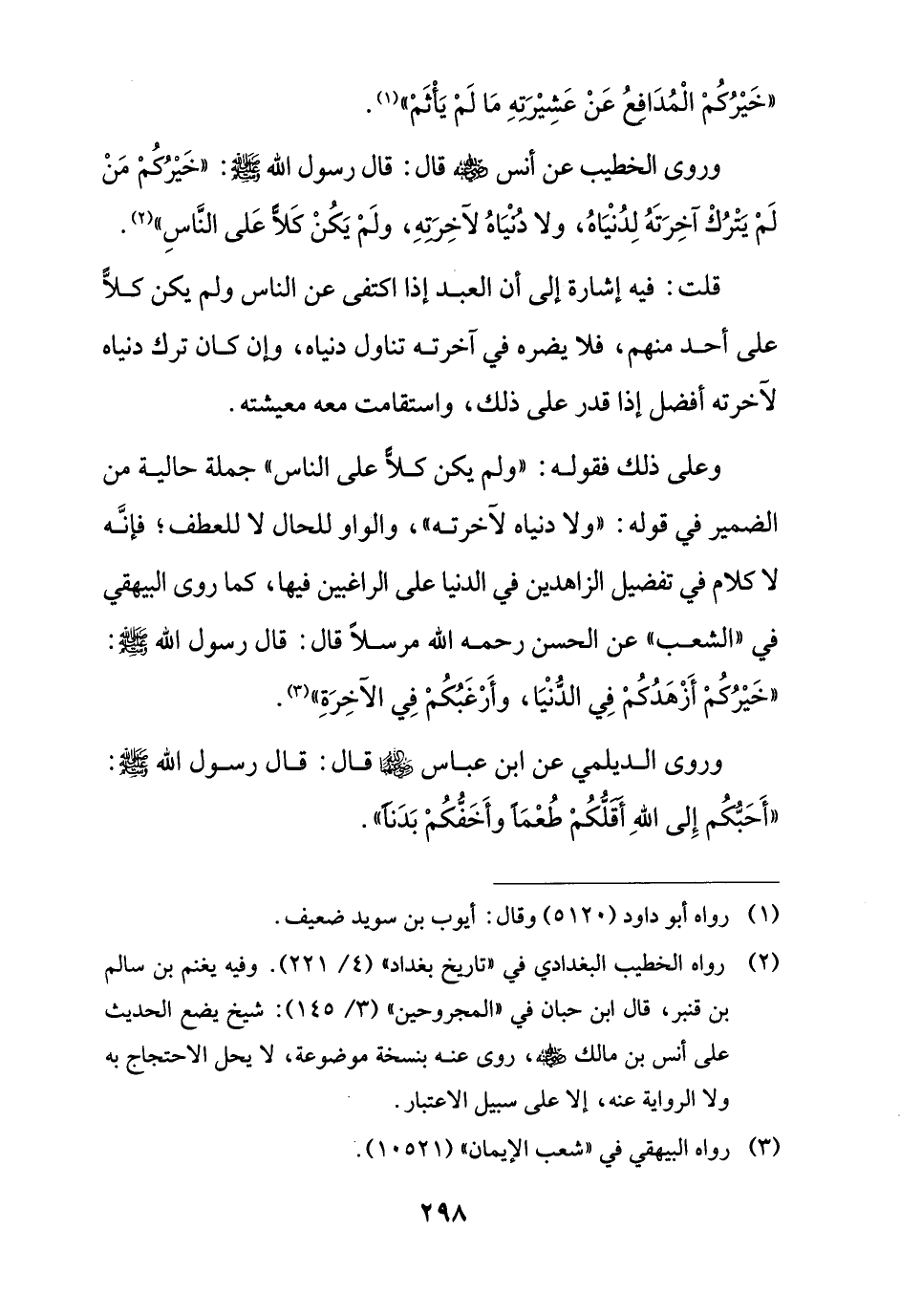 وعلى ذلك فقوله: "ولم يكن كلًّا على الناس" جملة حالية من الضمير في قوله: "ولا دنياه لآخرته"، والواو للحال لا للعطف؛ فإنَّه لا كلام في تفضيل الزاهدين في الدنيا على الراغبين فيها، كما روى البيهقي في "الشعب" عن الحسن رحمه الله مرسلاً قال: قال رسول الله - صلى الله عليه وسلم -: "خَيْرُكُمْ أَزْهَدُكُمْ فِي الدُّنْيَا، وأَرْغَبُكُمْ فِي الآخِرَةِ" (¬3).