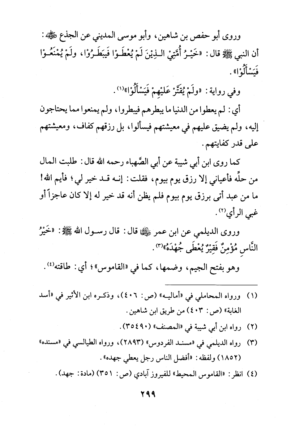وروى الديلمي عن ابن عمر - رضي الله عنه - قال: قال رسول الله - صلى الله عليه وسلم -: "خَيْرُ النَّاسِ مُؤْمِنٌ فَقِيْرٌ يُعْطَى جُهْدَه" (¬3).