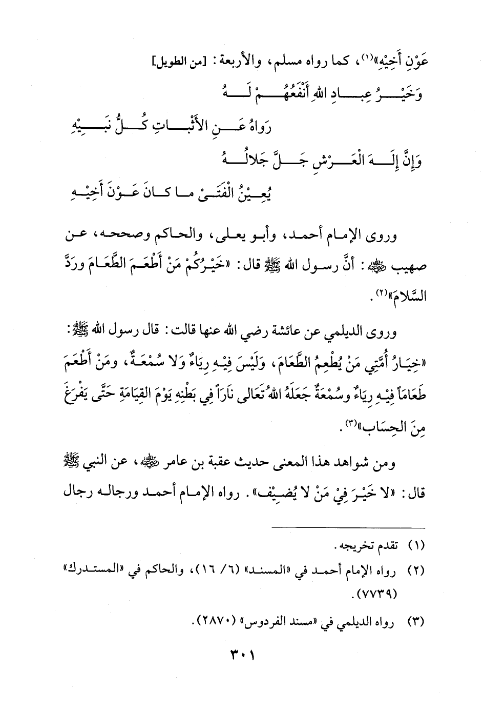 وروى الإمام أحمد، وأبو يعلى، والحاكم وصححه، عن صهيب - رضي الله عنه -: أنَّ رسول الله - صلى الله عليه وسلم - قال: "خَيْرُكُمْ مَنْ أَطْعَمَ الطَّعَامَ ورَدَّ السَّلام" (¬2).