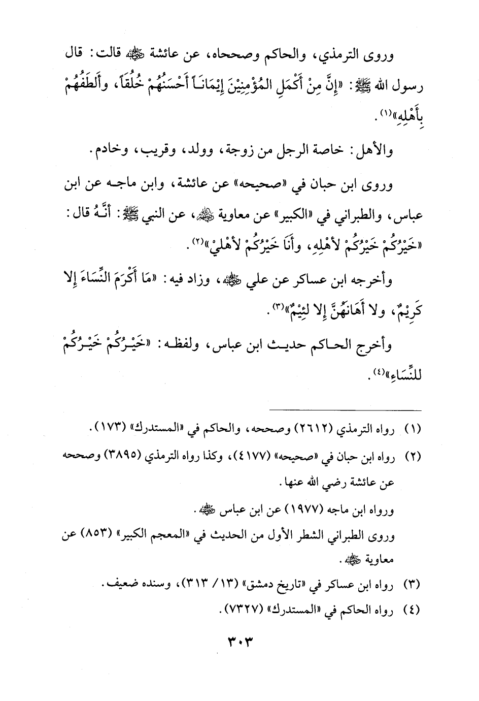 وروى الترمذي، والحاكم وصححاه، عن عائشة - رضي الله عنها - قالت: قال رسول الله - صلى الله عليه وسلم -: "إِنَّ مِنْ أَكْمَلِ المُؤْمِنِيْنَ إِيْمَانًا أَحْسَنُهُمْ خُلُقًا، وأَلطَفُهُمْ بِأَهْلِهِ" (¬1).