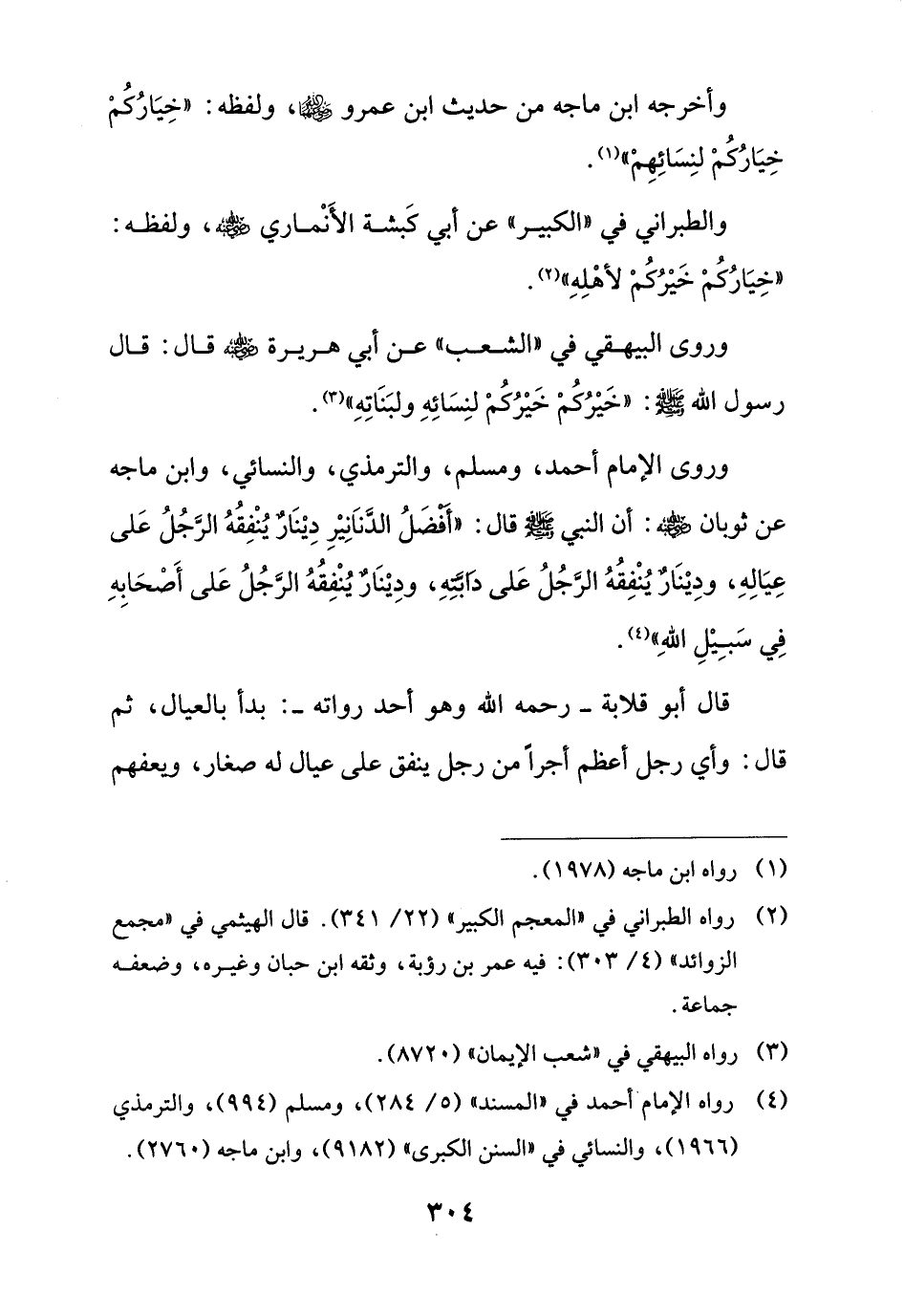 وروى الإمام أحمد، ومسلم، والترمذي، والنسائي، وابن ماجه عن ثوبان - رضي الله عنه -: أن النبي - صلى الله عليه وسلم - قال: "أَفْضَلُ الدَّنَانِيْرِ دِيْنَارٌ يُنْفِقُهُ الرَّجُلُ عَلى عِيَالِهِ، ودِيْنَارٌ يُنْفِقُهُ الرَّجُلُ عَلى دَابَّتِهِ، ودِيْنَارٌ يُنْفِقُهُ الرَّجُلُ عَلى أَصْحَابِهِ فِي سَبِيْلِ الله" (¬4).