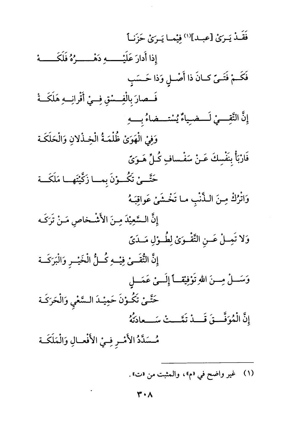 وَاتْرُكْ مِنَ الذنْبِ ما تَخْشَىْ عَواقِبَهُ ... إِنَّ السَّعِيْدَ مِنَ الأَشْخاصِ مَنْ تَرَكَه