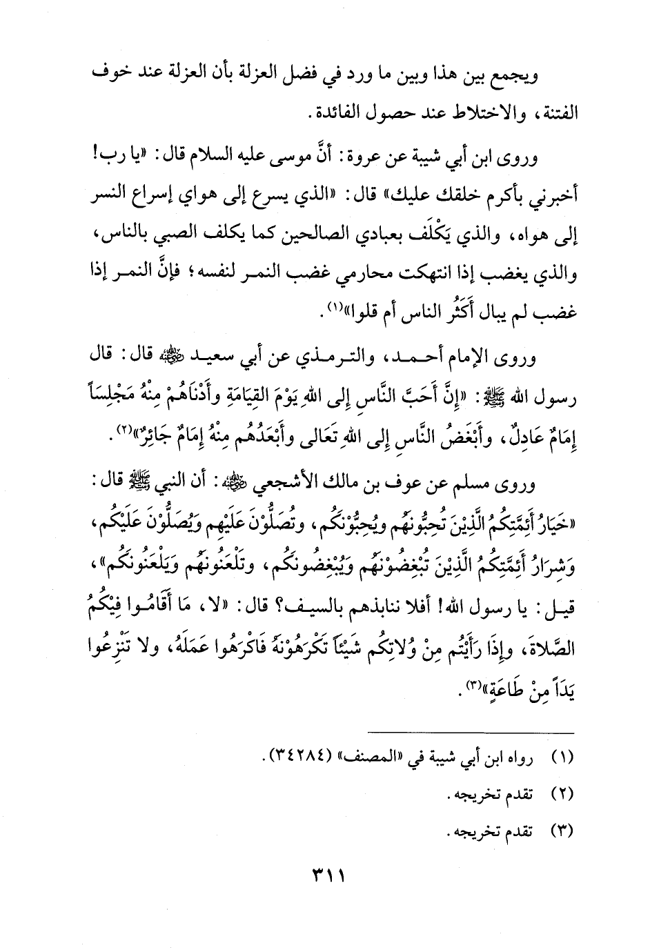 وروى مسلم عن عوف بن مالك الأشجعي - رضي الله عنه -: أن النبي - صلى الله عليه وسلم - قال: "خَيَارُ أَئِمَّتِكُمُ الَّذِيْنَ تُحِبُّونَهُم ويُحِبُّوْنَكُم، وتُصَلُّوْنَ عَلَيْهِم وُيصَلُّوْنَ عَلَيْكُم، وَشِرَارُ أَئِمَّتِكُمُ الَّذِيْنَ تُبْغِضُوْنَهُم وُيبْغِضُونَكُم، وتَلْعَنُونَهُم وَيَلْعَنُونَكُم"، قيل: يا رسول الله! أفلا ننابذهم بالسيف؟ قال: "لا، مَا أقامُوا فِيْكُمُ الصَّلاةَ، وإِذَا رَأَيْتُم مِنْ وُلاتِكُم شَيْئاً تَكْرَهُوْنهُ فَاكْرَهُوا عَمَلَهُ، ولا تَنْزِعُوا يَداً مِنْ طَاعَةٍ" (¬3).