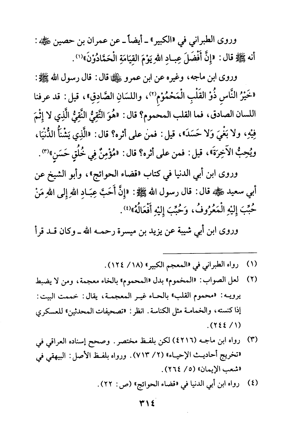 وروى ابن ماجه، وغيره عن ابن عمرو - رضي الله عنهما - قال: قال رسول الله - صلى الله عليه وسلم -: "خَيْرُ النَّاسِ ذُوْ القَلْبِ الْمَحْمُوْمِ (¬2)، واللسَانِ الصَّادِقِ"، قيل: قد عرفنا اللسان الصادق، فما القلب المحموم؛ قال: "هُوَ التَّقِيُّ النَّقِيُّ الَّذِي لا إِثْمَ فِيْهِ، ولا بَغْيَ وَلا حَسَدَ"، قيل: فمن على أثره؟ قال: "الَّذِي يَشْنأُ الدُّنْيَا، وُيحِبُّ الآخِرَةَ"، قيل: فمن على أثره؟ قال: "مُؤْمِنٌ فِي خُلُقٍ حَسَنٍ" (¬3).