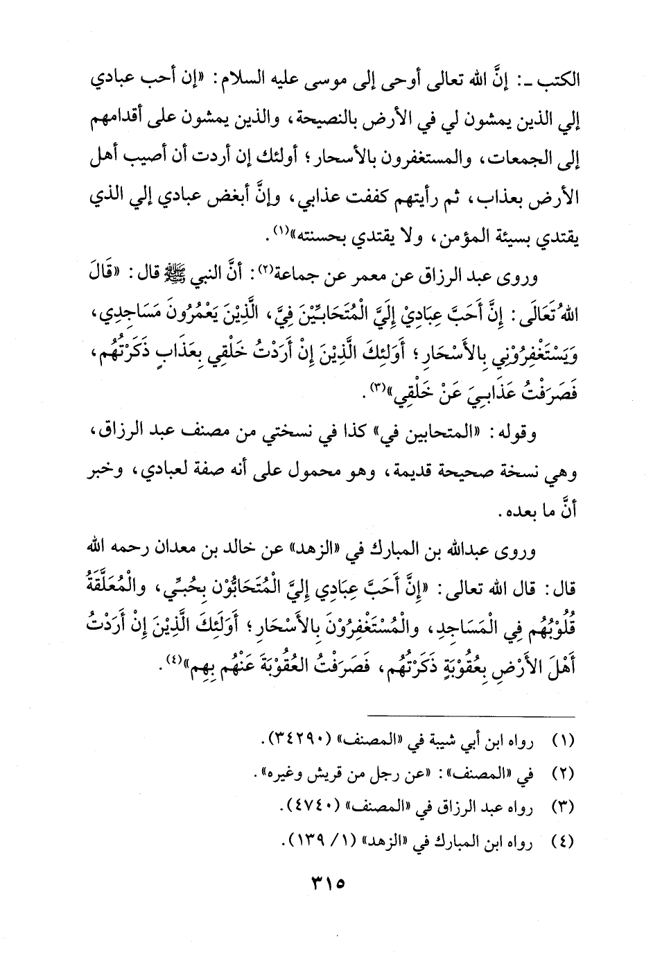 وروى عبد الله بن المبارك في "الزهد" عن خالد بن معدان رحمه الله قال: قال الله تعالى: "إِنَّ أَحَبَّ عِبَادِي إِليَّ الْمُتَحَابُّوْن بِحُبِّي، والْمُعَلَّقَةُ قُلُوْبُهُم فِي الْمَسَاجِدِ، والْمُسْتَغْفِرُوْنَ بِالأَسْحَارِ؛ أَوَلَئِكَ الَّذِيْنَ إِنْ أَرَدْتُ أَهْلَ الأَرْضِ بِعُقُوْبَةٍ ذَكَرْتُهُم، فَصَرَفْتُ العُقُوْبَةَ عَنْهُم بِهِم" (¬4).