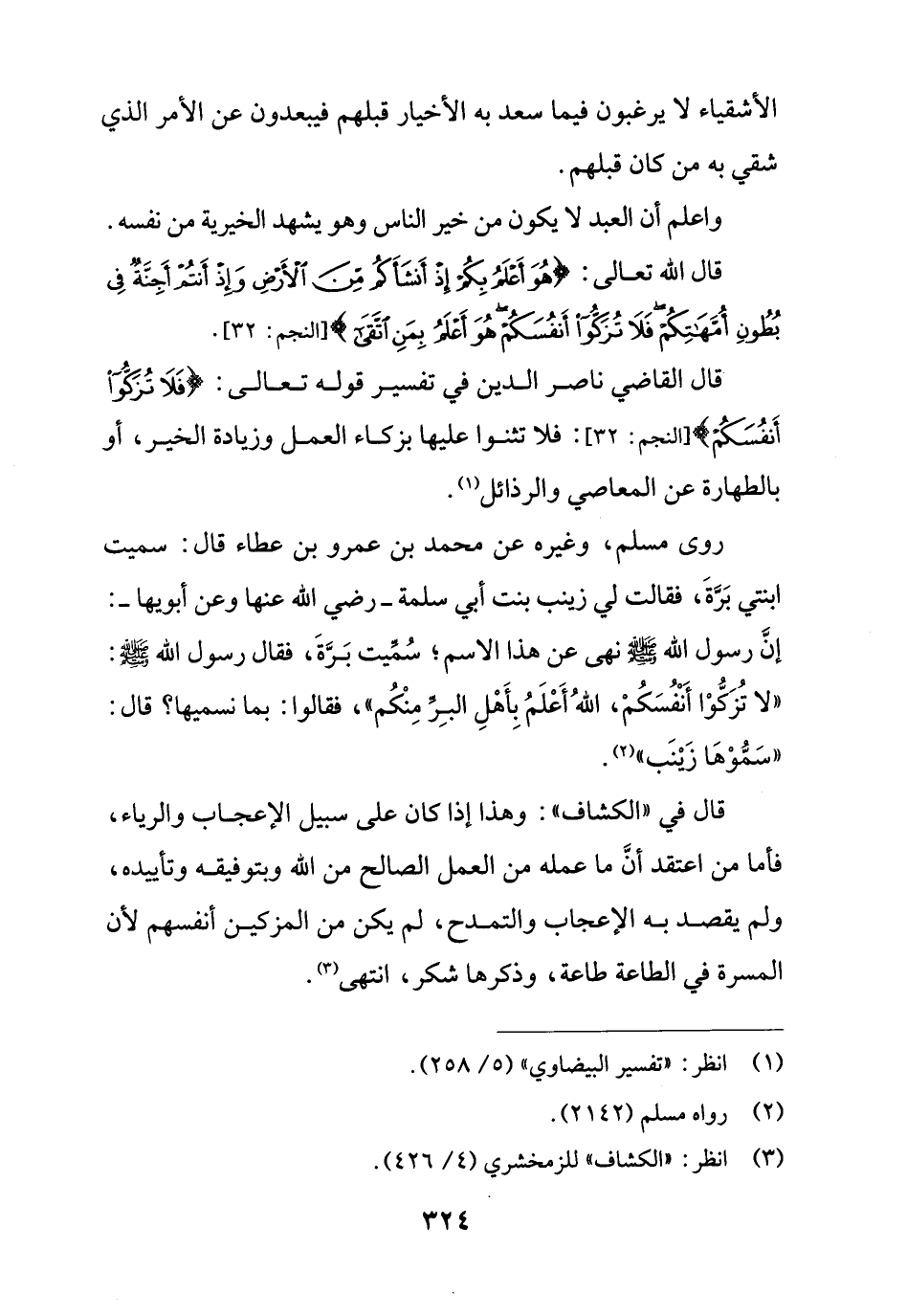 قال القاضي ناصر الدين في تفسير قوله تعالى: {فَلَا تُزَكُّوا أَنْفُسَكُمْ} [النجم: 32]: فلا تثنوا عليها بزكاء العمل وزيادة الخير، أو بالطهارة عن المعاصي والرذائل (¬1).