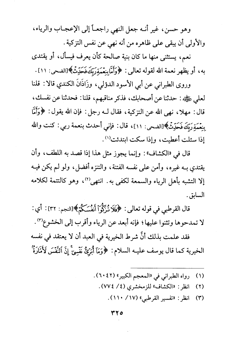 قال القرطبي في قوله تعالى: {فَلَا تُزَكُّوا أَنْفُسَكُمْ} [النجم: 32]: أي: لا تمدحوها وتثنوا عليها؛ فإنه أبعد عن الرياء وأقرب إلى الخشوع (¬3).