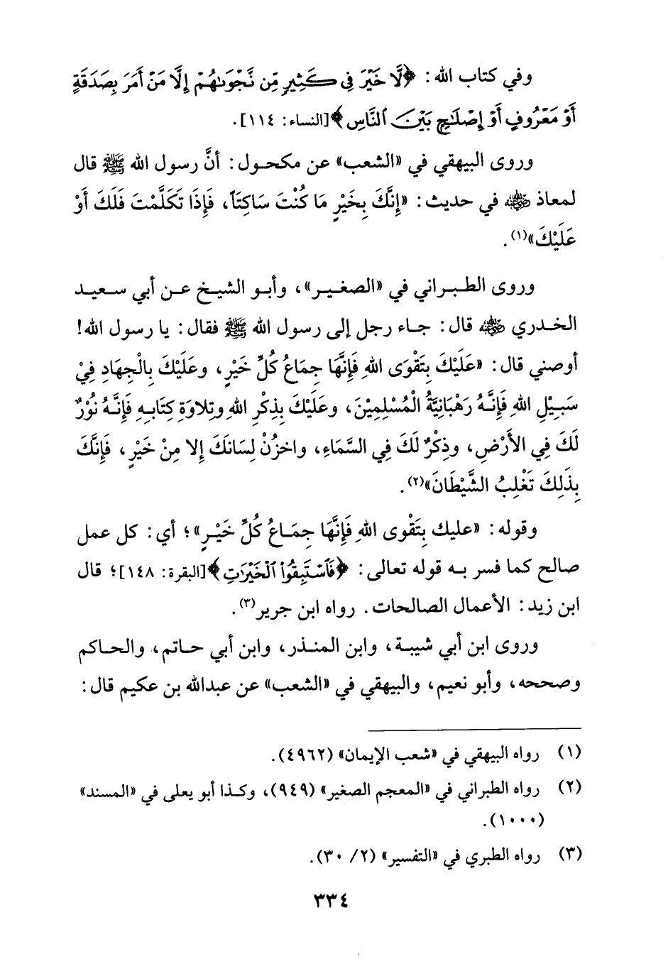 وروى الطبراني في "الصغير"، وأبو الشيخ عن أبي سعيد الخدري - رضي الله عنه - قال: جاء رجل إلى رسول الله - صلى الله عليه وسلم - فقال: يا رسول الله! أوصني قال: "عَلَيْكَ بِتَقْوَى اللهِ فَإنَّها جِمَاعُ كُلِّ خَيْرٍ، وعَلَيْكَ بِالْجِهَادِ فِيْ سَبِيْلِ اللهِ فَاِنَّهُ رَهْبَانِيَّةُ الْمُسْلِمِيْنَ، وعَلَيْكَ بِذِكْرِ اللهِ وتلاوَةِ كِتَابِهِ فَإِنَّهُ نُوْرٌ لَكَ فِي الأَرْضِ، وذِكْرٌ لَكَ فِي السَّمَاءِ، واخزُنْ لِسَانَكَ إِلا مِنْ خَيْرٍ، فَإِنَّكَ بِذَلِكَ تَغْلِبُ الشَّيْطَانَ" (¬2).