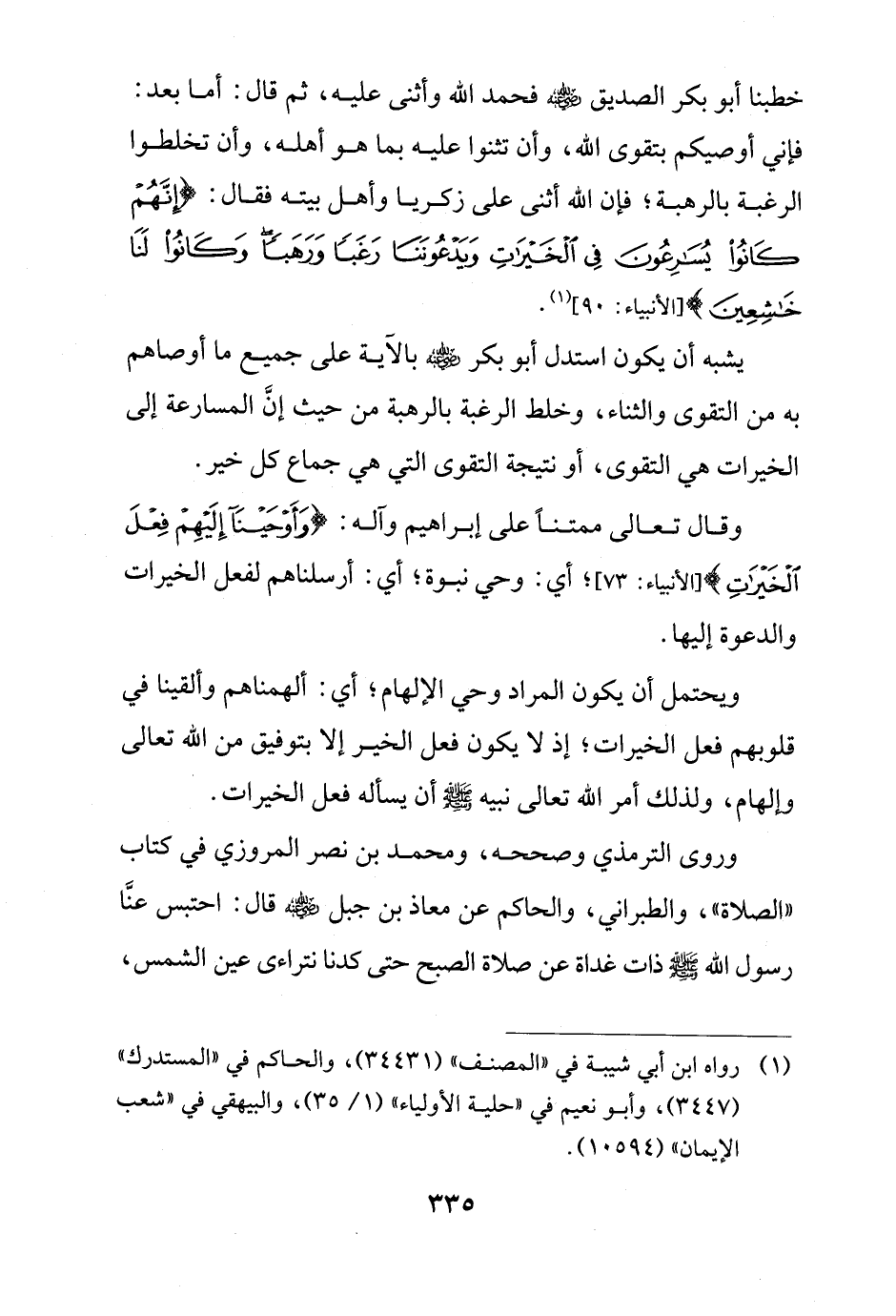 يشبه أن يكون استدل أبو بكر - رضي الله عنه - بالآية على جميع ما أوصاهم به من التقوى والثناء، وخلط الرغبة بالرهبة من حيث إنَّ المسارعة إلى الخيرات هي التقوى، أو نتيجة التقوى التي هي جماع كل خير.