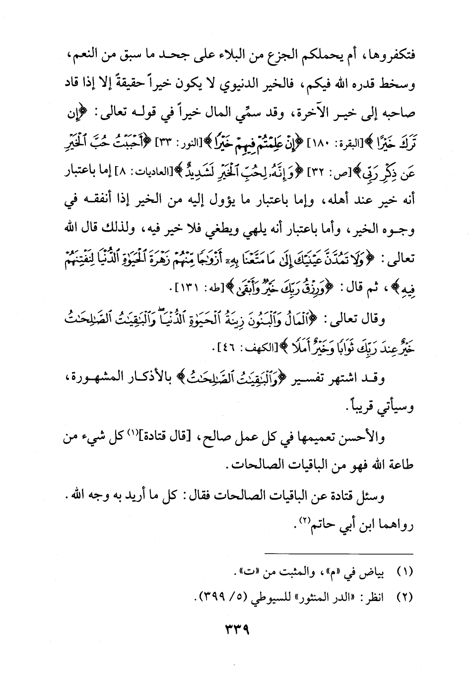 وسئل قتادة عن الباقيات الصالحات فقال: كل ما أريد به وجه الله. رواهما ابن أبي حاتم (¬2).