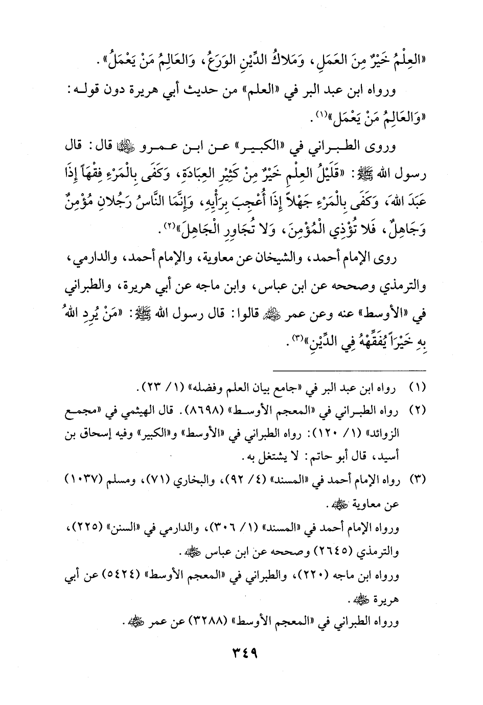 روى الإمام أحمد، والشيخان عن معاوية، والإمام أحمد، والدارمي، والترمذي وصححه عن ابن عباس، وابن ماجه عن أبي هريرة، والطبراني في "الأوسط" عنه وعن عمر - رضي الله عنه - قالوا: قال رسول الله - صلى الله عليه وسلم -: "مَنْ يُرِدِ اللهُ بِهِ خَيْرًا يُفَقَهْهُ فِي الدِّيْنِ" (¬3).
