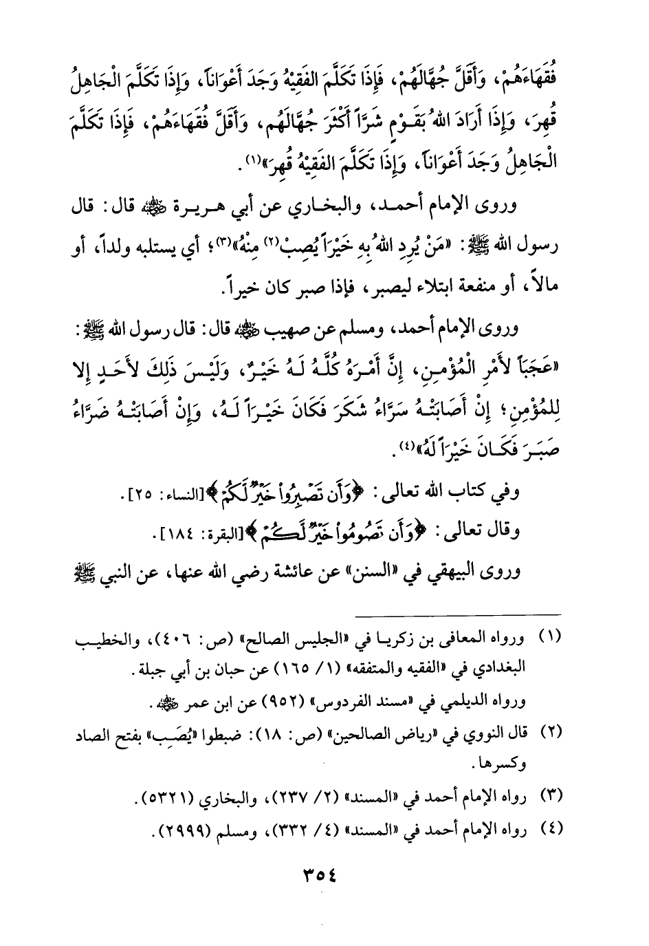 وروى الإمام أحمد، والبخاري عن أبي هريرة - رضي الله عنه - قال: قال رسول الله - صلى الله عليه وسلم -: "مَنْ يُرِدِ اللهُ بِهِ خَيْرًا يُصِبْ (¬2) منْهُ" (¬3)؛ أي يستلبه ولداً، أو مالاً، أو منفعة ابتلاء ليصبر، فإذا صبر كان خيراً.