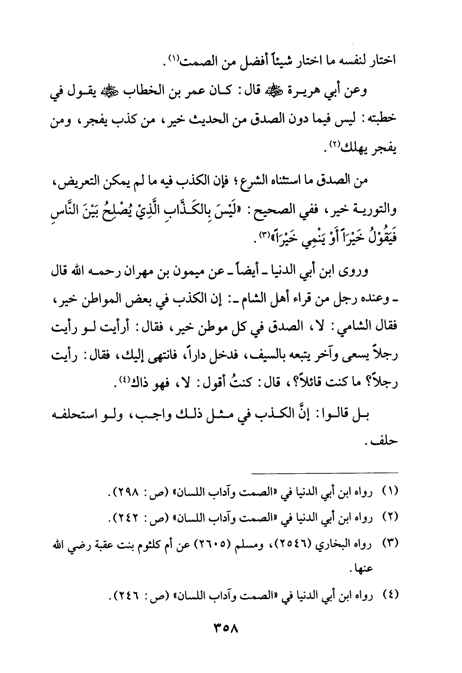 من الصدق ما استئناه الشرع؛ فإن الكذب فيه ما لم يمكن التعريض، والتورية خير، ففي الصحيح: "لَيْسَ بِالكَذَّابِ الَّذِيْ يُصْبحُ بَيْنَ النَّاسِ فَيَقُوْلُ خَيْرًا أَوْ يَنْمِي خَيْرًا" (¬3).