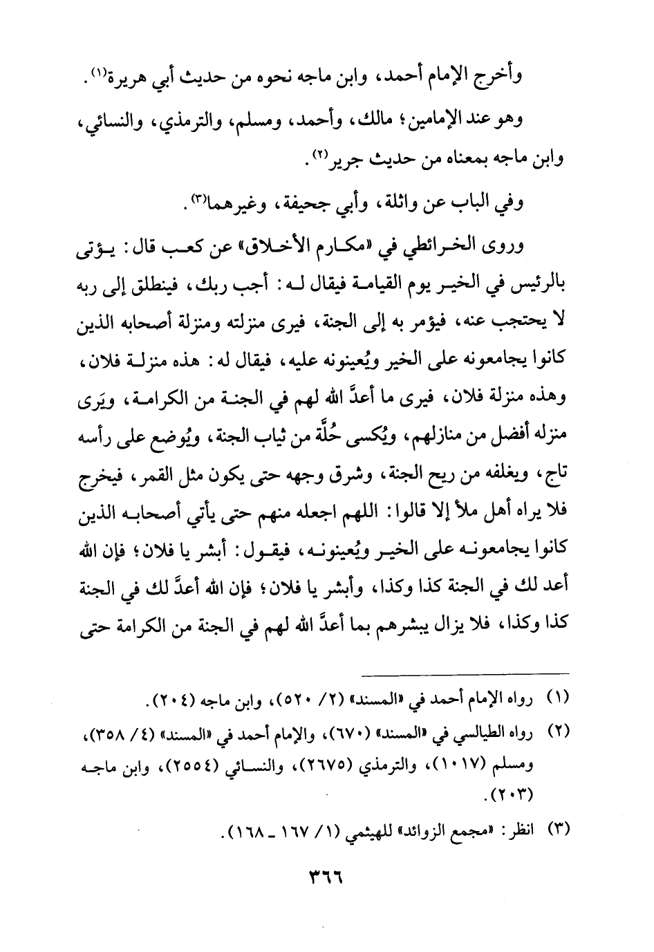 وروى الخرائطي في "مكارم الأخلاق" عن كعب قال: يؤتى بالرئيس في الخير يوم القيامة فيقال له: أجب ربك، فينطلق إلى ربه لا يحتجب عنه، فيؤمر به إلى الجنة، فيرى منزلته ومنزلة أصحابه الذين كانوا يجامعونه على الخير ويُعينونه عليه، فيقال له: هذه منزلة فلان، وهذه منزلة فلان، فيرى ما أعدَّ الله لهم في الجنة من الكرامة، وَيرى منزله أفضل من منازلهم، ويُكسى حُلَّة من ثياب الجنة، ويُوضع على رأسه تاج، ويغلفه من ريح الجنة، وشرق وجهه حتى يكون مثل القمر، فيخرج فلا يراه أهل ملأ إلا قالوا: اللهم اجعله منهم حتى يأتي أصحابه الذين كانوا يجامعونه على الخير ويُعينونه، فيقول: أبشر يا فلان؛ فإن الله أعد لك في الجنة كذا وكذا، وأبشر يا فلان؛ فإن الله أعدَّ لك في الجنة كذا وكذا، فلا يزال يبشرهم بما أعدَّ الله لهم في الجنة من الكرامة حتى
