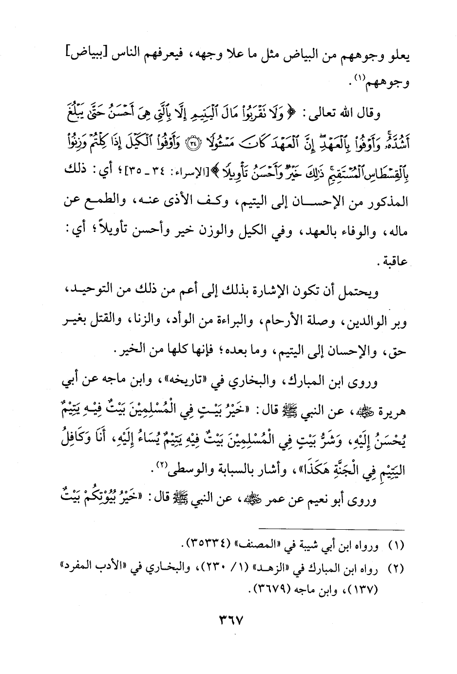 وروى ابن المبارك، والبخاري في "تاريخه"، وابن ماجه عن أبي هريرة - رضي الله عنه -، عن النبي - صلى الله عليه وسلم - قال: "خَيْرُ بَيْتٍ فِي الْمُسْلِمِيْنَ بَيْتٌ فِيْهِ يَتيْمٌ يُحْسَنُ إِلَيْهِ، وَشَرُّ بَيْتٍ فِي الْمُسْلِمِيْنَ بَيتٌ فِيْهِ يَتِيْمٌ يُسَاءُ إِلَيْهِ، أَنَا وَكَافِلُ اليَتِيْمِ فِي الْجَنَّةِ هَكَذَا"، وأشار بالسبابة والوسطى (¬2).