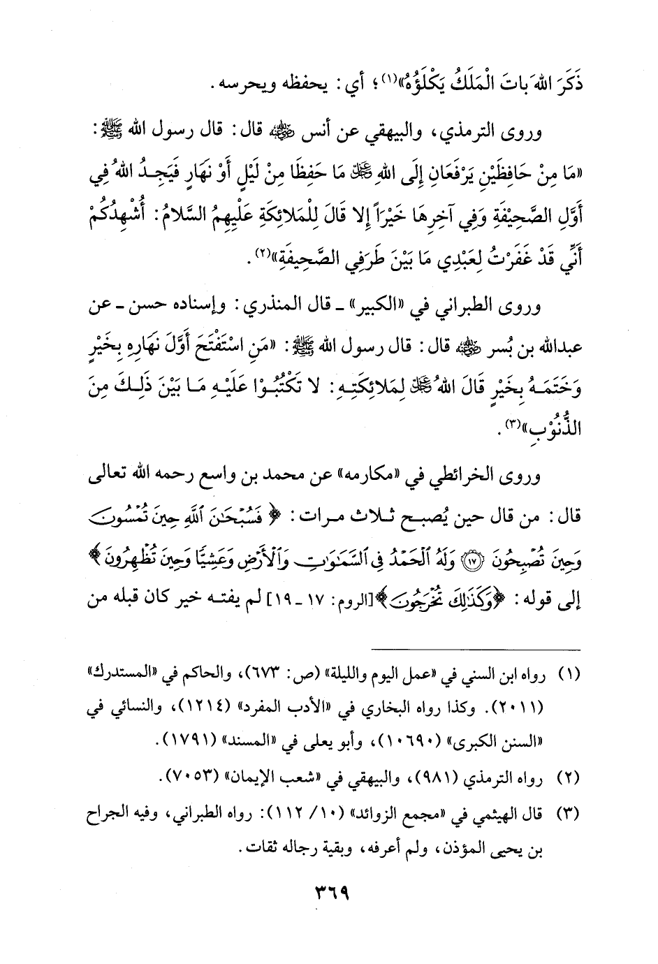 وروى الخرائطي في "مكارمه" عن محمد بن واسع رحمه الله تعالى قال: من قال حين يُصبح ثلاث مرات: {فَسُبْحَانَ اللَّهِ حِينَ تُمْسُونَ وَحِينَ تُصْبِحُونَ (17) وَلَهُ الْحَمْدُ فِي السَّمَاوَاتِ وَالْأَرْضِ وَعَشِيًّا وَحِينَ تُظْهِرُونَ} إلى قوله: {وَكَذَلِكَ تُخْرَجُونَ} [الروم: 17 - 19] لم يفته خير كان قبله من