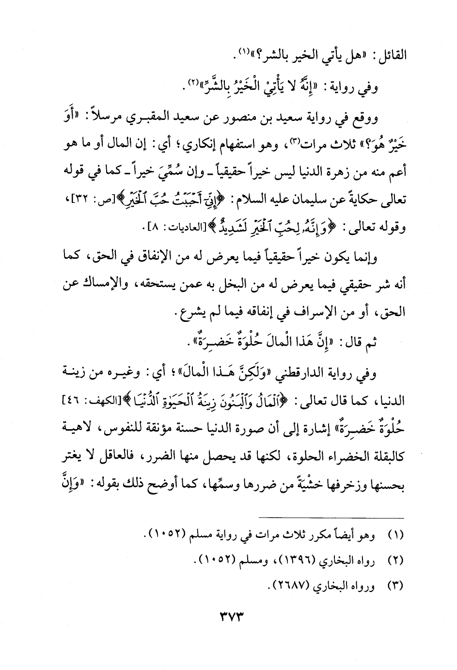 ووقع في رواية سعيد بن منصور عن سعيد المقبري مرسلاً: "أَوَ خَيْر هُوَ؟ " ثلاث مرات (¬3)، وهو استفهام إنكاري؛ أي: إن المال أو ما هو أعم منه من زهرة الدنيا ليس خيراً حقيقياً - وإن سُمِّيَ خيراً - كما في قوله تعالى حكايةً عن سليمان عليه السلام: {إِنِّي أَحْبَبْتُ حُبَّ الْخَيْرِ} [ص: 32]، وقوله تعالى: {وَإِنَّهُ لِحُبِّ الْخَيْرِ لَشَدِيدٌ} [العاديات: 8].