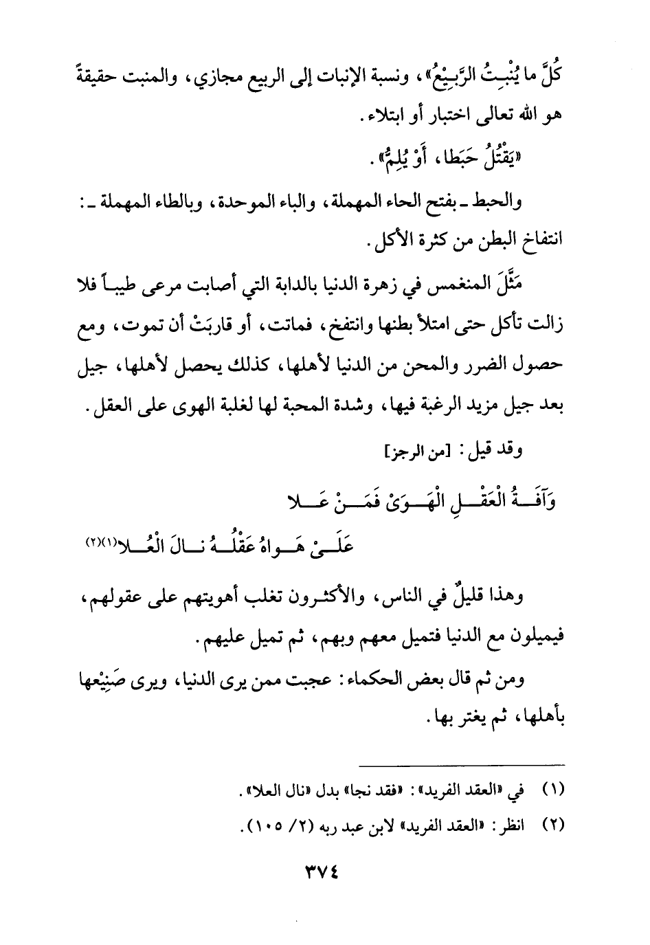 مَثَّلَ المنغمس في زهرة الدنيا بالدابة التي أصابت مرعى طيباً فلا زالت تأكل حتى امتلأ بطنها وانتفخ، فماتت، أو قاربَتْ أن تموت، ومع حصول الضرر والمحن من الدنيا لأهلها، كذلك يحصل لأهلها، جيل بعد جيل مزيد الرغبة فيها، وشدة المحبة لها لغلبة الهوى على العقل.