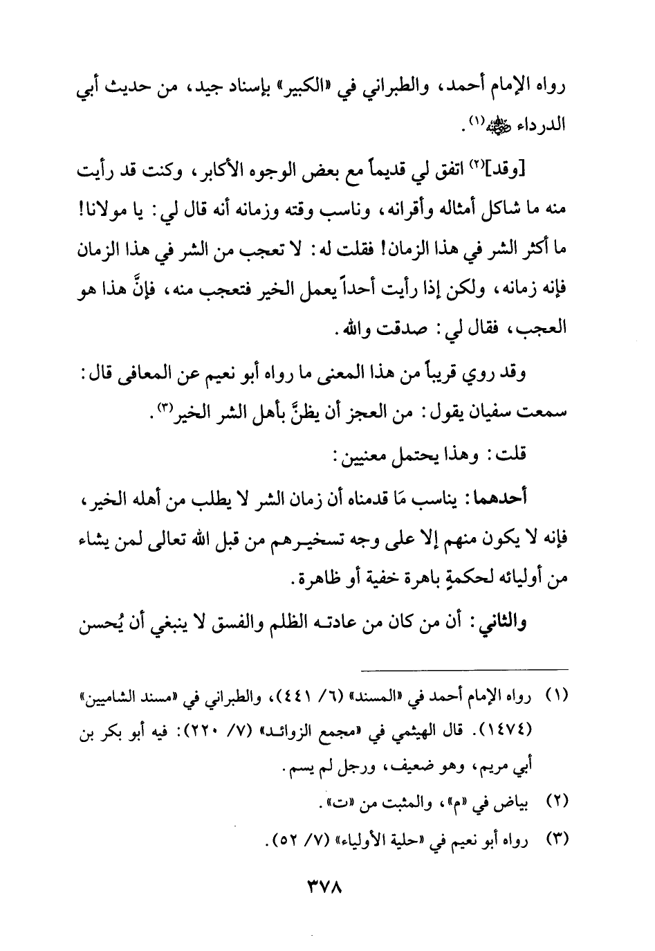 [وقد] (¬2) اتفق لي قديماً مع بعض الوجوه الأكابر، وكنت قد رأيت منه ما شاكل أمثاله وأقرانه، وناسب وقته وزمانه أنه قال لي: يا مولانا! ما أكثر الشر في هذا الزمان! فقلت له: لا تعجب من الشر في هذا الزمان فإنه زمانه، ولكن إذا رأيت أحداً يعمل الخير فتعجب منه، فإنَّ هذا هو العجب، فقال لي: صدقت والله.