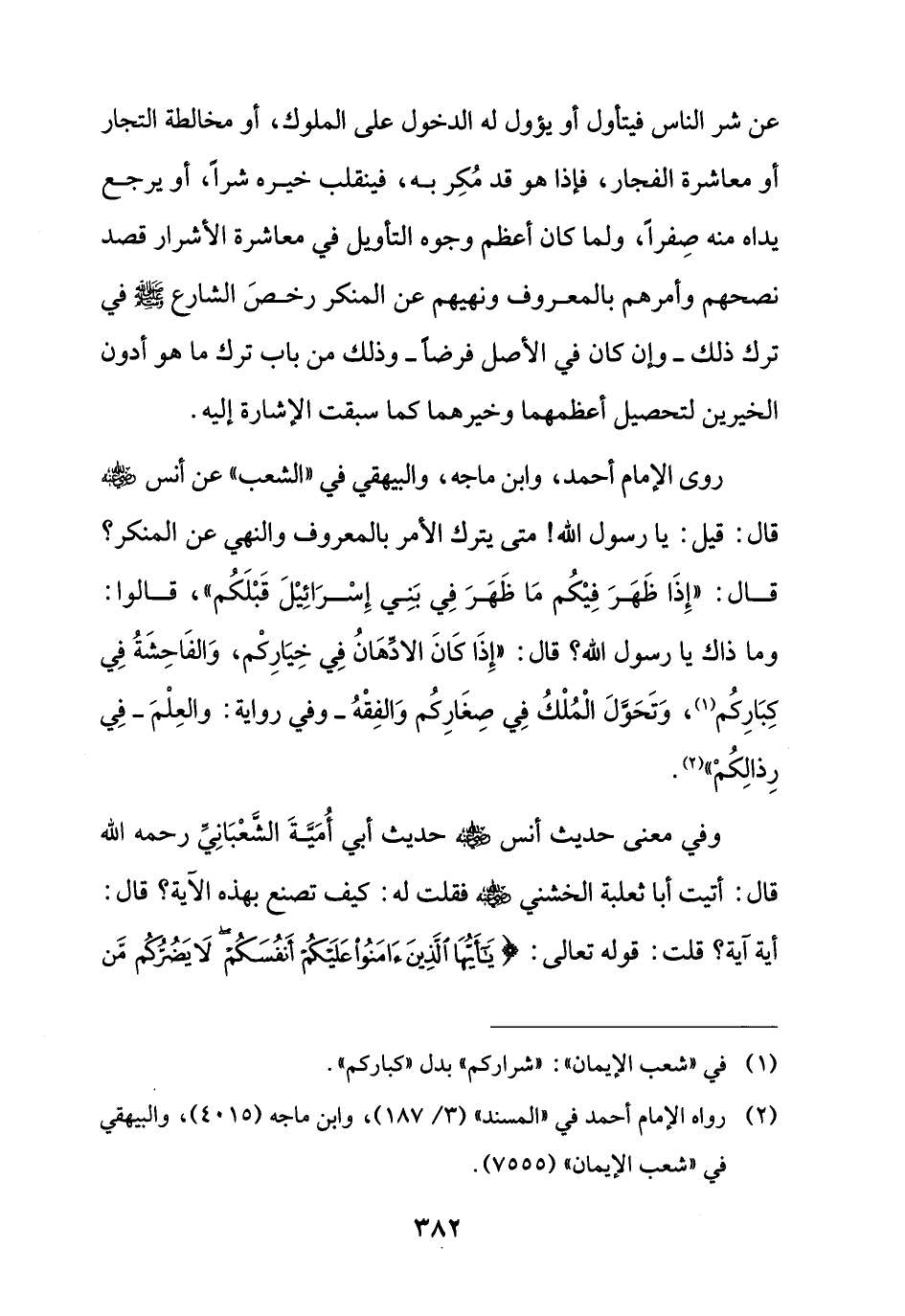 وفي معنى حديث أنس - رضي الله عنه - حديث أبي أُمَيَّةَ الشَّعْبَانِيِّ رحمه الله قال: أتيت أبا ثعلبة الخشني - رضي الله عنه - فقلت له: كيف تصنع بهذه الآية؟ قال: أية آية؛ قلت: قوله تعالى: {يَا أَيُّهَا الَّذِينَ آمَنُوا عَلَيْكُمْ أَنْفُسَكُمْ لَا يَضُرُّكُمْ مَنْ