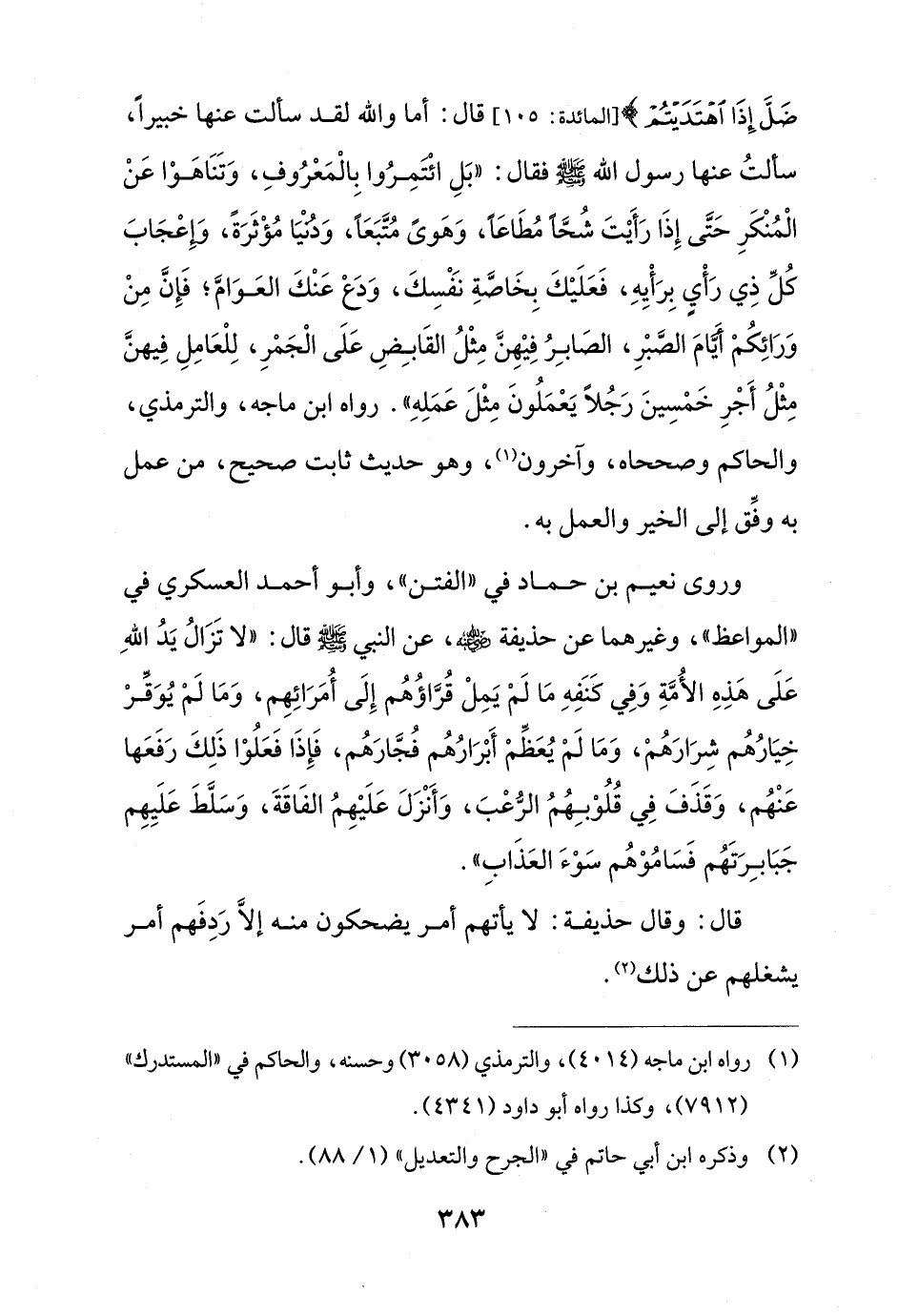 ضَلَّ إِذَا اهْتَدَيْتُمْ} [المائدة: 105] قال: أما والله لقد سألت عنها خبيراً، سألتُ عنها رسول الله - صلى الله عليه وسلم - فقال: "بَلِ ائْتَمِرُوا بِالْمَعْرُوفِ، وَتَنَاهَوْا عَنْ الْمُنْكَرِ حَتَّى إِذَا رَأَيْتَ شُحًّا مُطَاعًا، وَهَوًى مُتَّبَعًا، وَدنْيَا مُؤْثَرَةً، وإِعْجَابَ كُلِّ ذِي رَأْيِ بِرَأْيِهِ، فَعَلَيْكَ بِخَاصَّةِ نَفْسِكَ، وَدعْ عَنْكَ العَوَامَّ، فَإِنَّ مِنْ وَرَائِكُمْ؛ أيَّامَ الصَّبْرِ، الصَابِرُ فِيْهِنَّ مِثْلُ القَابِضِ عَلَى الْجَمْرِ، لِلْعَامِلِ فِيهنَّ مِثْلُ أَجْرِ خَمْسِينَ رَجُلاً يَعْمَلُونَ مِثْلَ عَمَلِهِ". رواه ابن ماجه، والترمذي، والحاكم وصححاه، وآخرون (¬1)، وهو حديث ثابت صحيح، من عمل به وفِّق إلى الخير والعمل به.
