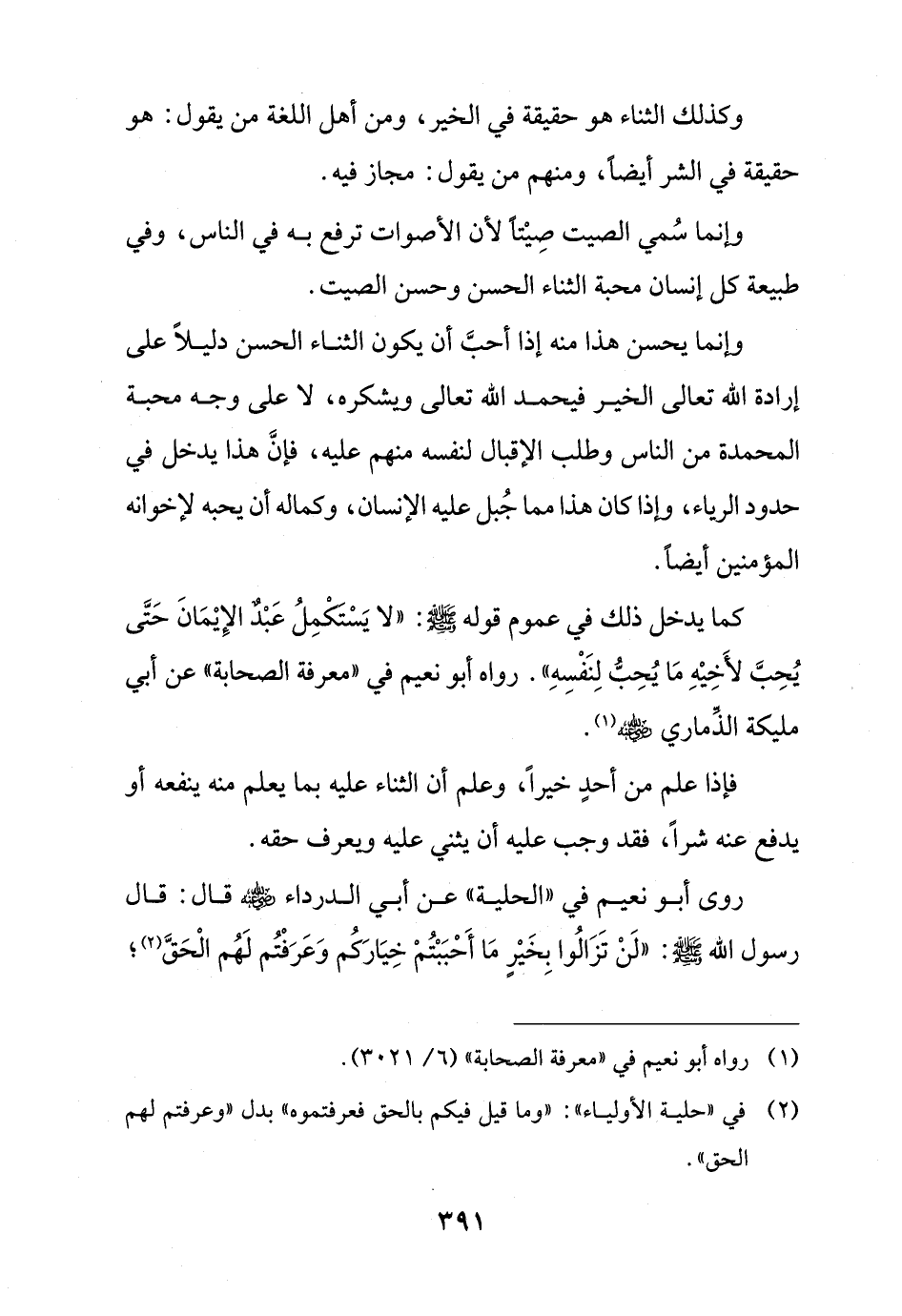 وإنما يحسن هذا منه إذا أحبَّ أن يكون الثناء الحسن دليلاً على إرادة الله تعالى الخير فيحمد الله تعالى ويشكره، لا على وجه محبة المحمدة من الناس وطلب الإقبال لنفسه منهم عليه، فإنَّ هذا يدخل في حدود الرياء، وإذا كان هذا مما جُبل عليه الإنسان، وكماله أن يحبه لإخوانه المؤمنين أيضاً.