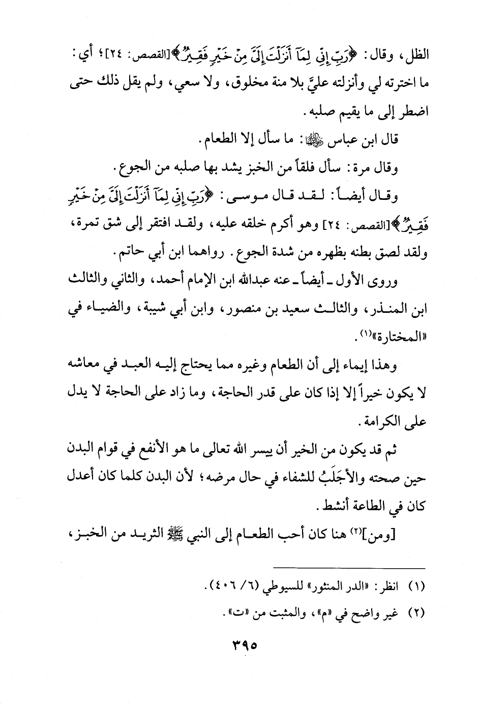 وقال أيضاً: لقد قال موسى: {رَبِّ إِنِّي لِمَا أَنْزَلْتَ إِلَيَّ مِنْ خَيْرٍ فَقِيرٌ} [القصص: 24] وهو أكرم خلقه عليه، ولقد افتقر إلى شق تمرة، ولقد لصق بطنه بظهره من شدة الجوع. رواهما ابن أبي حاتم.
